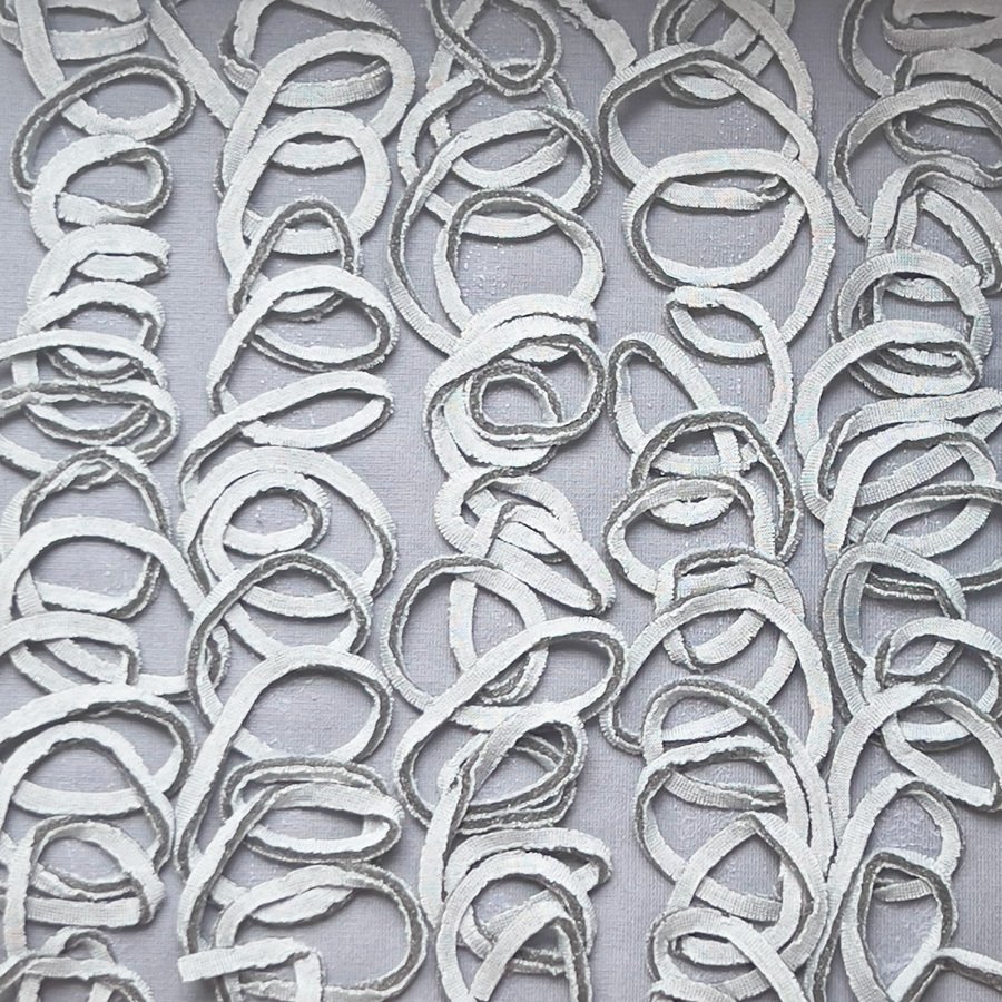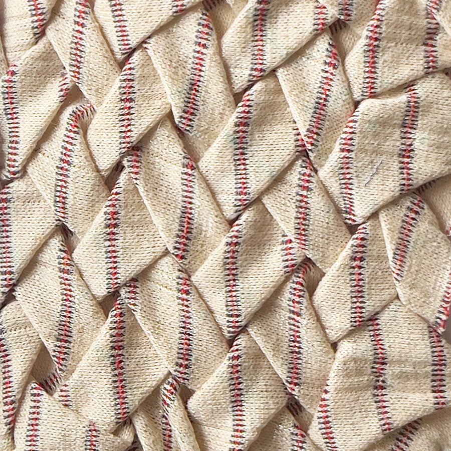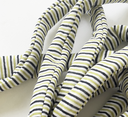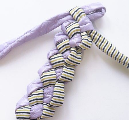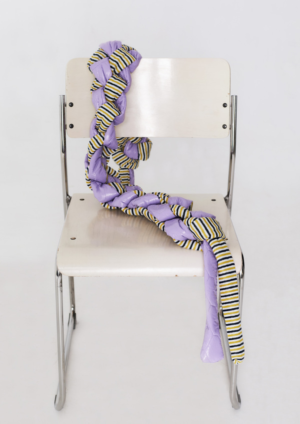 Шарф-фенечка выполнен из объемных полос — из полосатого трикотажа и глянцевой плащевой ткани. Это сочетание отображает одновременно ассоциативное смешение и контраст мягких и уютных фактур с синтетическими и пластмассовыми материалами.