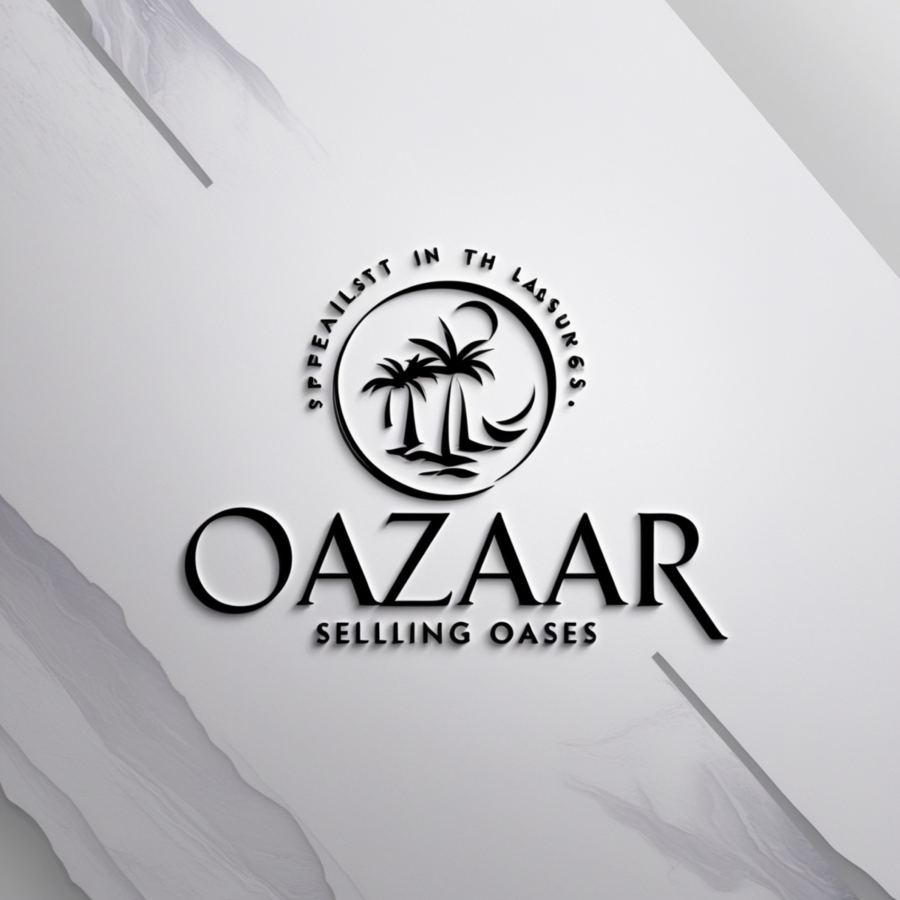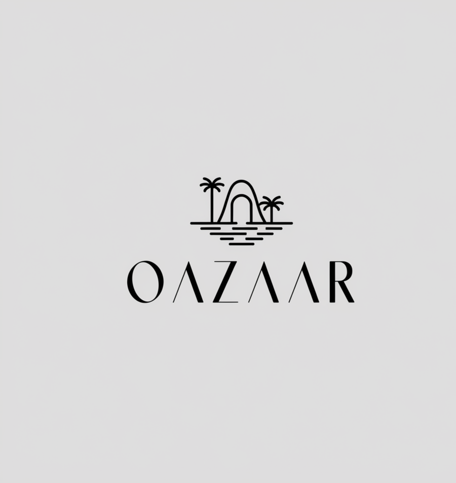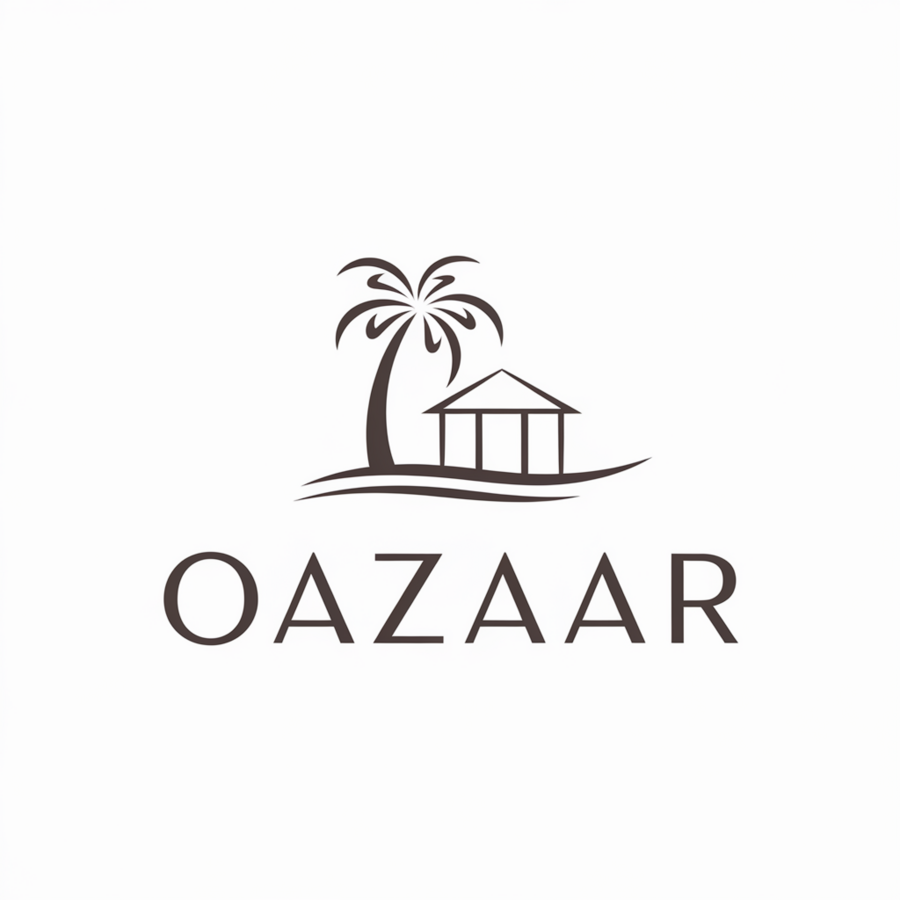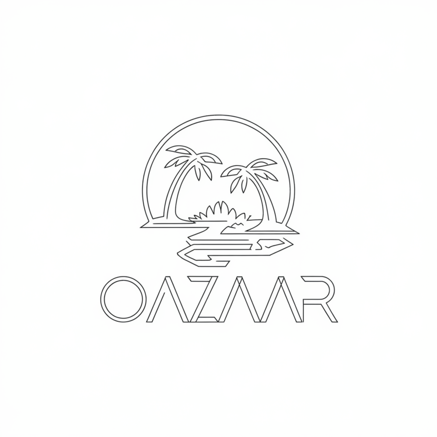 prompt: create a minimalistic logo for «Oazaar», a company specializing in selling oases. The logo features the text «Oazaar» in a modern font. Below the text is a simple, stylized image of an oasis with a few palm trees and water. The background is white.