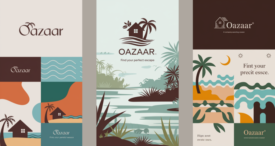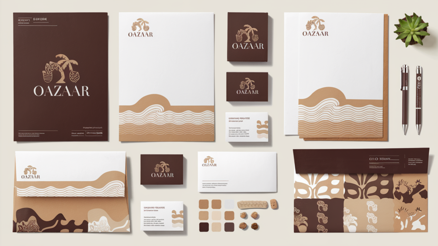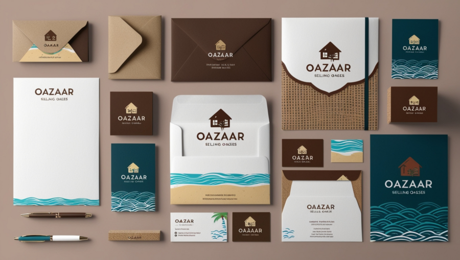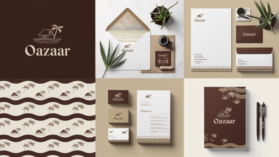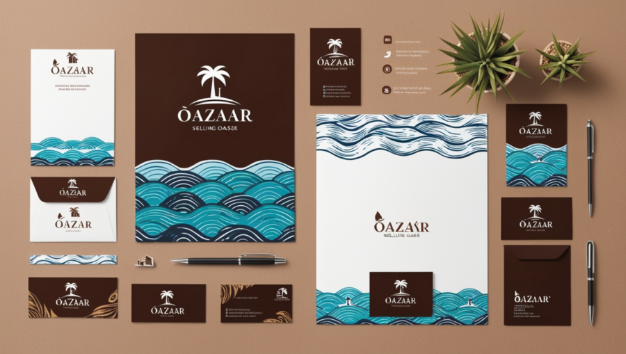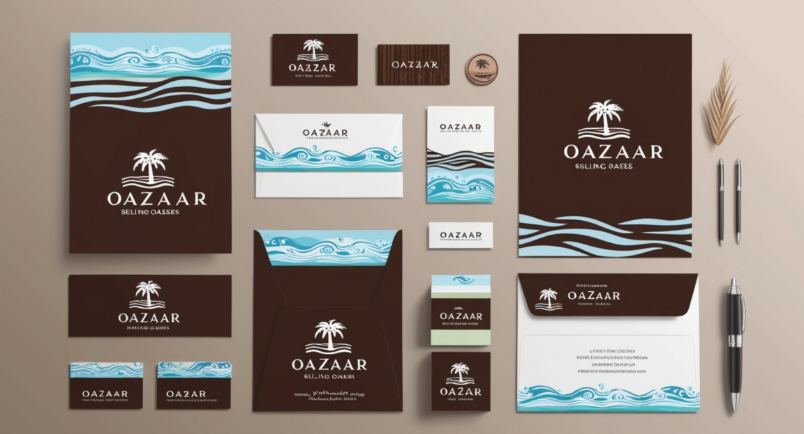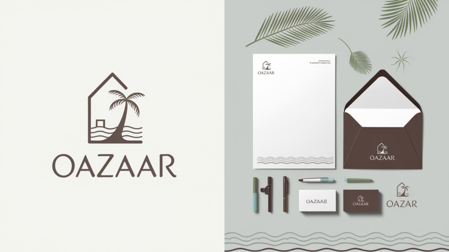 Promt: create a cohesive set of branding materials for «Oazaar», a company specializing in selling oases. The materials should include paper, envelopes, business cards, and pens and so on, all featuring the company logo. The dark brown logo shows a form of house and palm, standing on the beach near the sea with text «OAZAAR» writing in Masley font. Incorporate design elements that reflect thestyle of oases, such as natural colors, natural motives and relaxing waves. You can also add some pattern