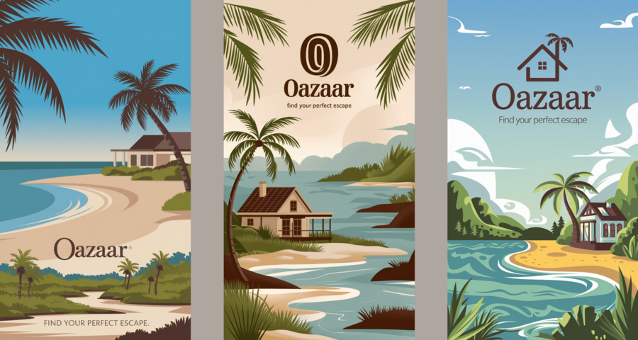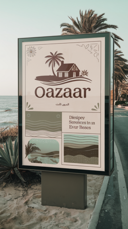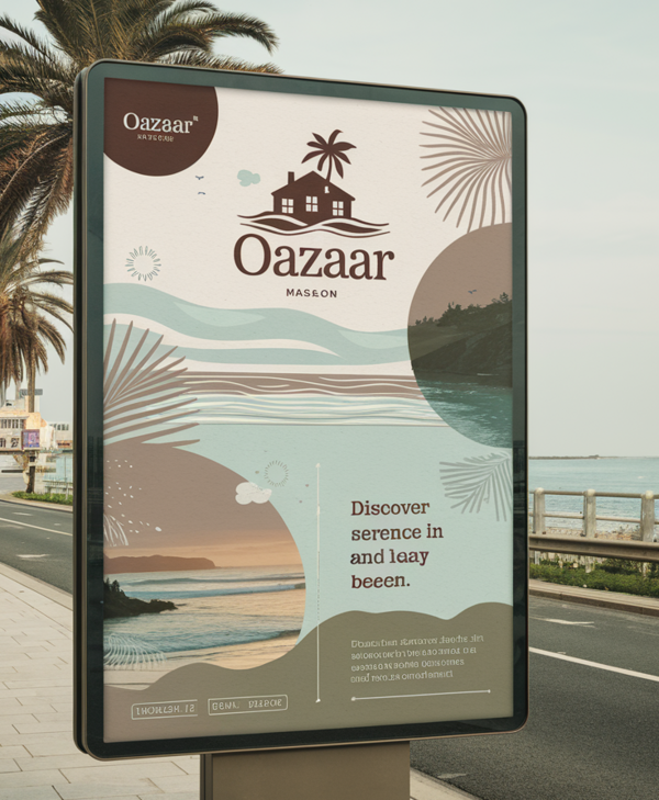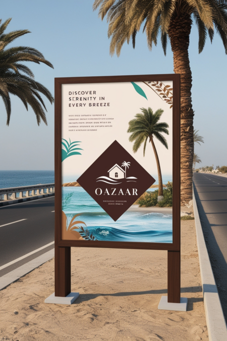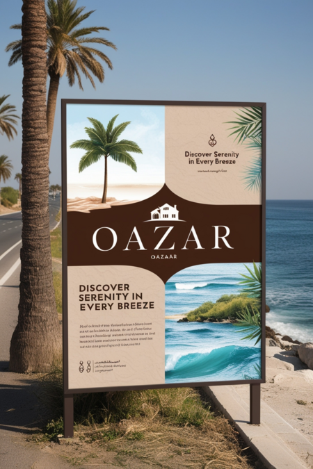 Promt: Create a realistic mockup of a poster for «Oazaar» placed along a coastal road. The poster should prominently feature the company’s dark brown logo, which depicts a house with a palm tree standing on the beach near the sea, with the text «OAZAAR» written in Masley font. Incorporate design elements that evoke the serene and tranquil essence of oases, using a palette of natural colors (light brown and a bit light blue and green) and motives. Include imagery of relaxing waves and lush landscapes to create a sense of calm and escape. Add a tagline, such as"Discover Serenity in Every Breeze» to enhance the message and draw attention to the brand.The color palette evokes a relaxing atmosphere, using natural colors that blend harmoniously with the coastal scenery. The design should include elements of gentle waves and inviting beach motifs to enhance the oasis theme. The mockup should realistically portray the poster. In the background there is the sea, some palms and the road. Less