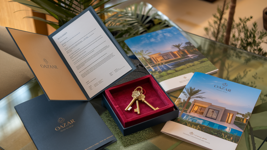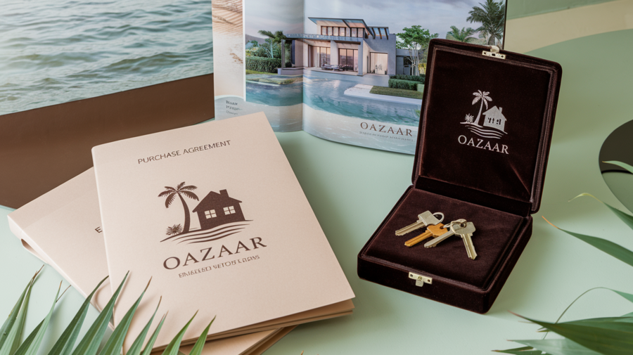 Promt: Create a scene featuring an elegant folder displaying a purchase agreement, neatly opened on a table. Beside it, beautifully crafted keys are presented in a stylish velvet-lined dark brown box. In the background, include a brochure showcasing a luxurious villa from the company «Oazaar,» which specializes in selling oases. All objects should have the same branding style of the company «Oazaar». Feature the company’s dark brown logo, which depicts a house with a palm tree standing on the beach near the sea, with the text «OAZAAR» written in Masley font. Incorporate design elements that evoke the serene and tranquil essence of oases, using a palette of natural colors (light brown and a bit light blue and green) and motives. Include imagery of relaxing waves and lush landscapes to create a sense of calm and escape