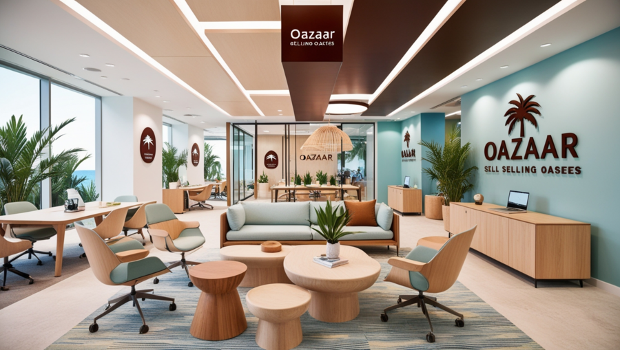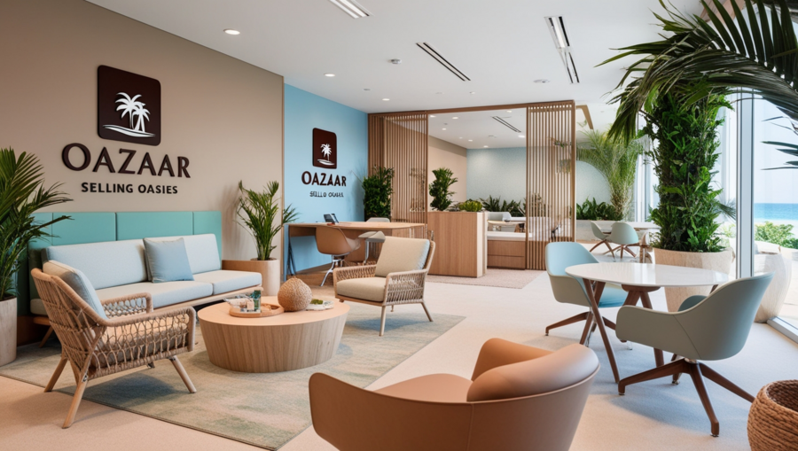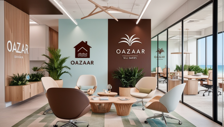 Promt: create a modern office space designed for the «Oazaar», a company selling oases. The office should feature contemporary furniture with natural materials and a color palette that includes soft light browns, light blues, and greens. Incorporate the «Oazaar» dark brown logo, depicting a house with a palm near the sea. Put branding elements on walls. Showcase an open, airy layout with large windows allowing natural light to flood the space, adorned with plants that evoke a sense of lush landscapes. Include comfortable workspaces with stylish desks, ergonomic chairs, and collaborative areas, creating a welcoming and inspiring environment.