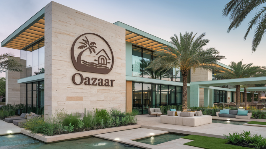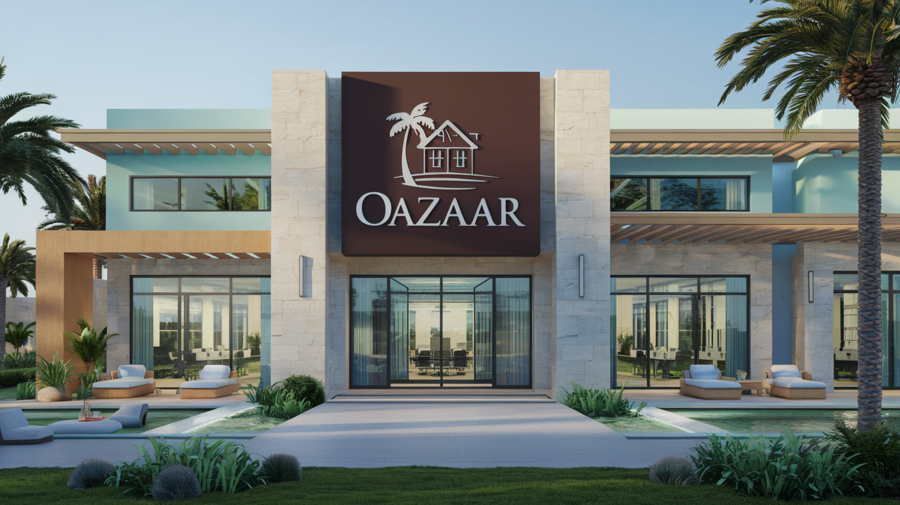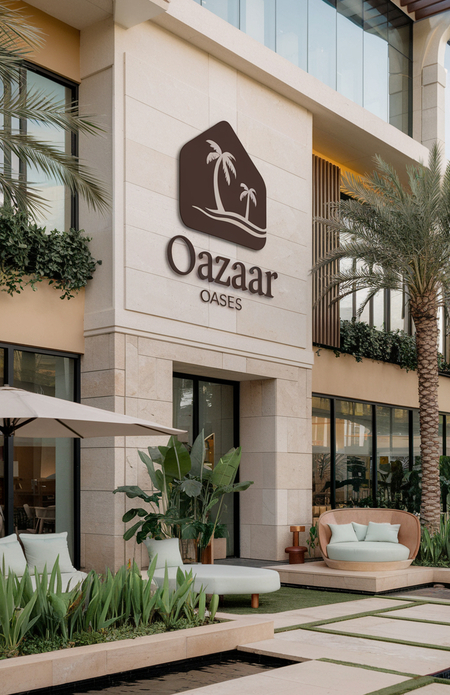 Promt: Create an image of the exterior of a modern office building designed for the «Oazaar» a company, selling oases. The building should feature a contemporary architecture with natural materials such as stone and wood, reflected in a harmonious color palette of light browns, soft blues, and greens. Show the «Oazaar» dark brown logo prominently onto the facade, depicting a house with a palm tree near the beach, along with the text «OAZAAR» in the elegant Masley font. Surround the building with lush landscaping, including palm trees and green plants, evoking a serene oasis atmosphere. Showcase large windows that allow natural light to shine through. Include outdoor seating areas with comfortable lounges and gentle water features to enhance the calming environment.