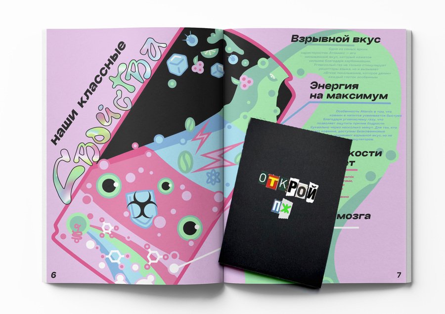 Журнал «Эффект Атомикса» — это креативное издание, посвящённое одноимённой газировке, которая позиционируется как яркий, взрывной продукт с «атомной» энергией. Он объединяет науку, мифы и развлечения, превращая простой напиток в символ энергии и креатива.