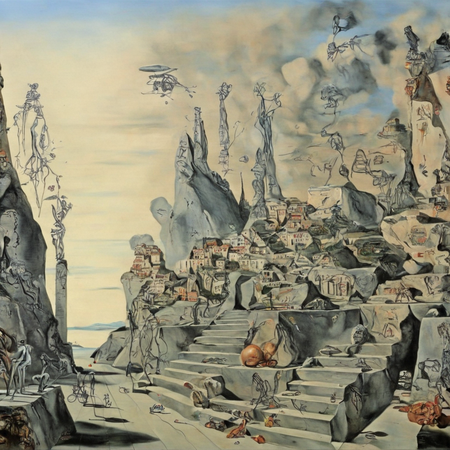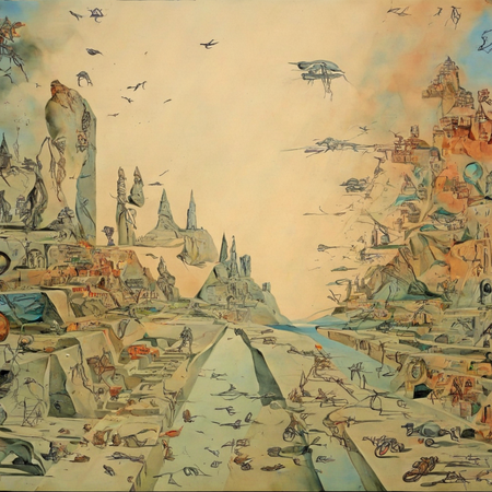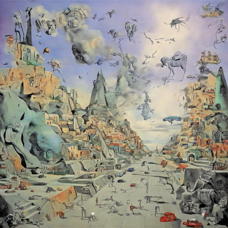 В итоговой серии изображений представлены адаптации картин Сальвадора Дали. Тематика была создать город будущего стилем Дали. Где будут присутствовать здания различной высоты и разнообразие уровня постройки в городе. Удалось сохранить сюрреалистичные образы и элементы стиля художника, цвета и фактурность. Также были добавлены люди и машины, по мимо основного запроса. Первоначально нейросеть обработала изображения, сделав их менее насыщенными объектами. Уже после были добавлены другие элементы, которые заметны на последних итоговых изображениях.