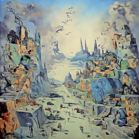 Используя пример кода, обучить генеративную нейросеть Stable Diffusion: Нарисовать изображения адаптированные под стиль художника Сальвадора Дали. Изобразить город будущего, добавить больше красок и цветных деталей в стиле сюрреализма, также добавить 3-4 животных, ходящих по улице и парящих в воздухе.