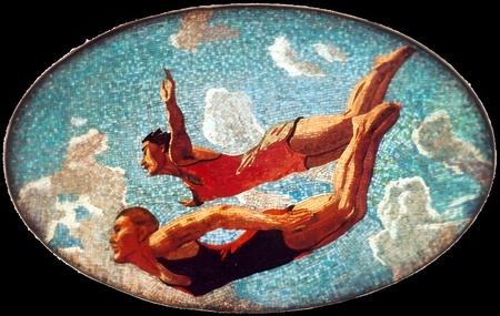 Слева на фото: Мозаика на здании Дворца пионеров на Воробьёвых горах 1962 г. «Юные ленинцы» 1962 г. И. В. Пчельников, И. Лаврова, Г. Дервиз, А. Губарев, Е. Аболин. Она посвящена темам детства, мечты и единства народов.