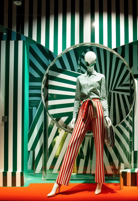 Стайлинг манекенов: Фирменная полоска Marni в пространстве витрины перерождается в одежду манекена. Она как вторая кожа. Эта трехмерность отражает тенденции современной моды. Манекен сохраняет свой объем и является частью этого творческого хаоса, а не сторонним наблюдателем. Он сделан из современных пластичных материалов и вобрал в себя всё изобилие текстур, что отражает невозмутимое стремление к желаниям. Фланёрское настроение коллекции ss24 передано воздушными элементами, которые по форме напоминают аксессуары коллекции.