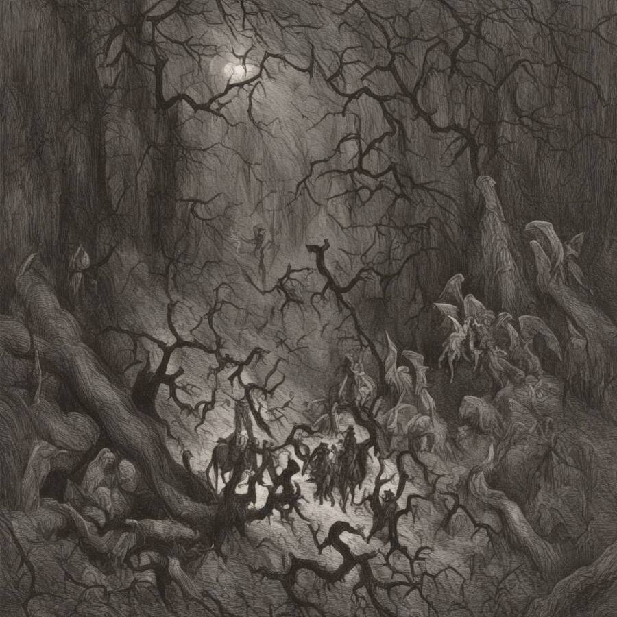 Ниже представлены несколько сгенерированных изображений, выполненных в стиле Гюстава Доре.
