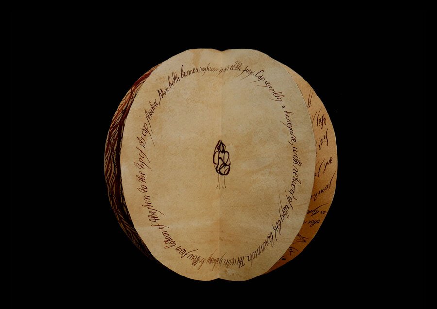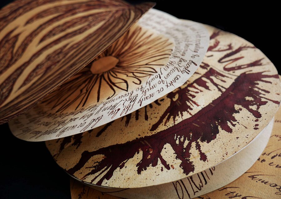 Зин погружает в причудливый и запутанный мир царства грибов. Каждый разворот посвящен определенному виду и включает различных представителей: от плесени до лисичек и мухоморов. На каждом развороте можно найти описание внешнего вида гриба и где он встречается в природе. Форма книжки выбрана неслучайно: круг похож на нижнюю сторону шляпки, в сложенном виде на верхушку сбоку, а в разложенном на пластинки под шляпкой гриба.