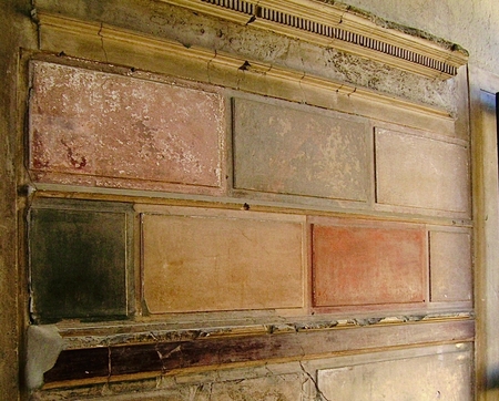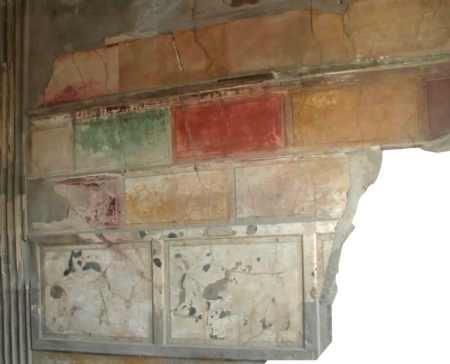 Первый помпейский стиль или «инкрустационный» (ок. 200–80 гг. до н. э.) представляет собой имитацию «под мрамор» на окрашенной цветом штукатурке. Как правило, мастера делили стену на три зоны и в верхней завершали лепнинными молдингами.