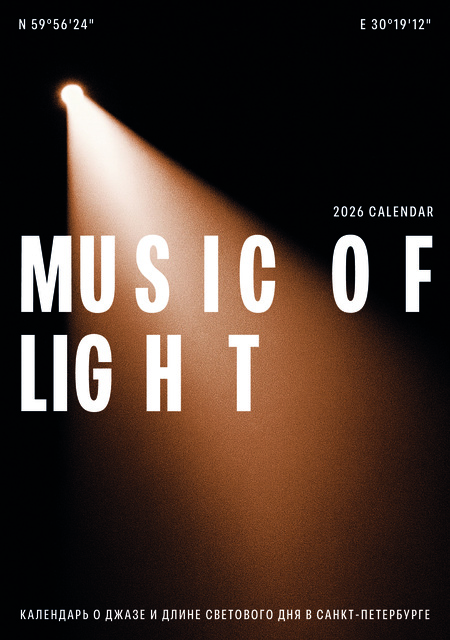 Концепция календаря объединяет две темы — джаз и длительность светового дня в Санкт-Петербурге. Каждый месяц показывает, как меняется соотношение дня и ночи — сколько в среднем часов солнечного света и часов темноты в сутках этого месяца. Цветовое решение отражает баланс света, а композиция вдохновлена ритмом и структурой музыкальной партитуры.