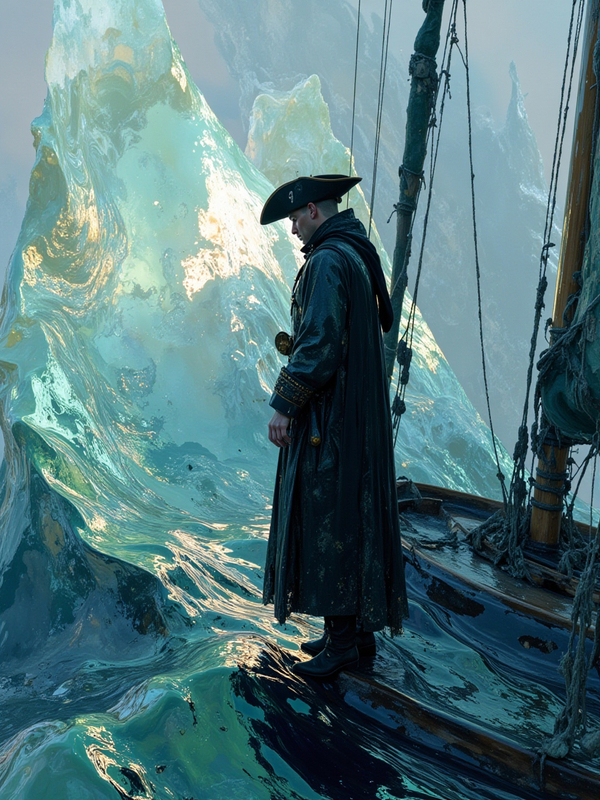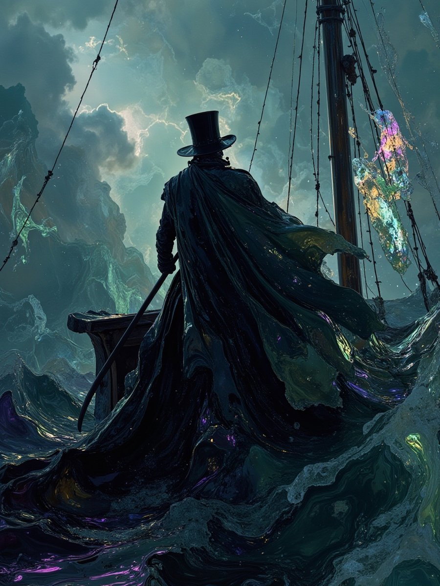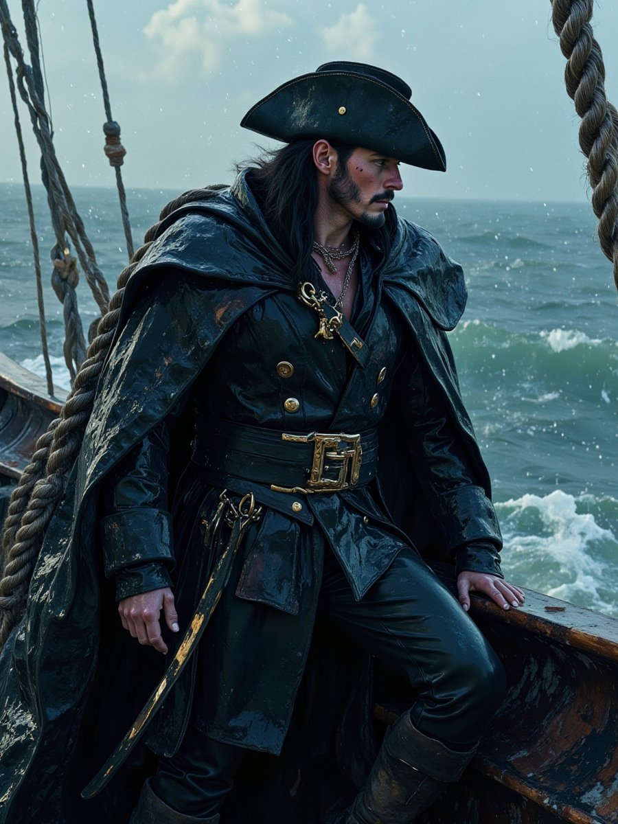 Канонир: Pirate is on a ship, looking into the distance, camera position is below him. He is dressed like a commander. He has a long black cape, top hat? cane and a lot of guns. He is surrounded by sea in stormy weather.