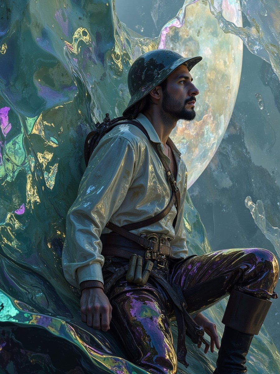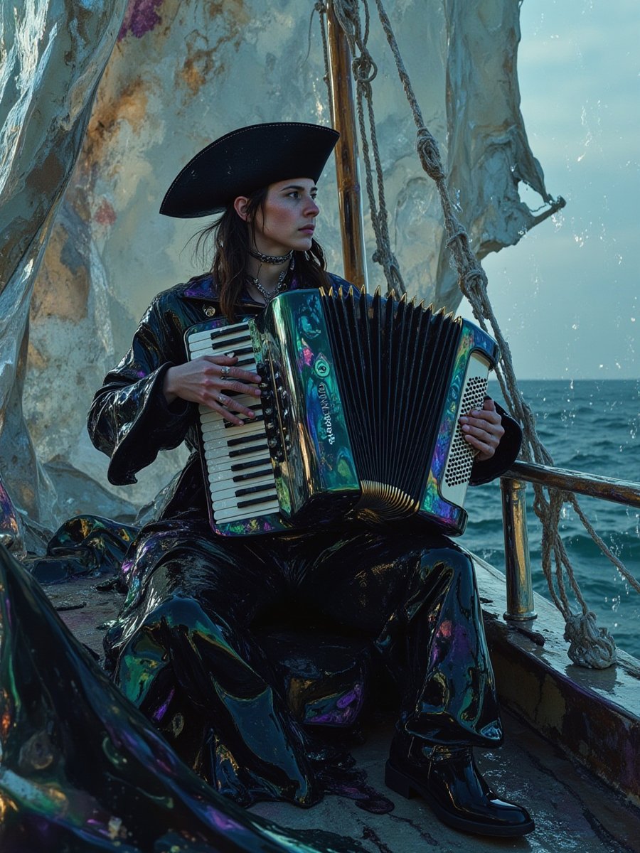 Музыкант: Pirate is on a ship, looking into the distance, camera position is below him. irate is a musician. He is dressed like a fancy pirate with a lot of piercing on his face, his hair is braided. He holds a huge accordion. He is surrounded by sea in stormy weather.