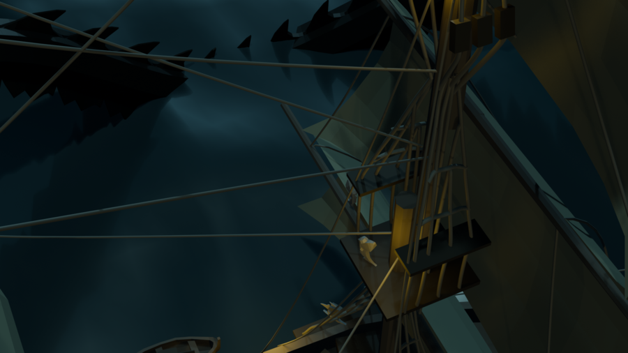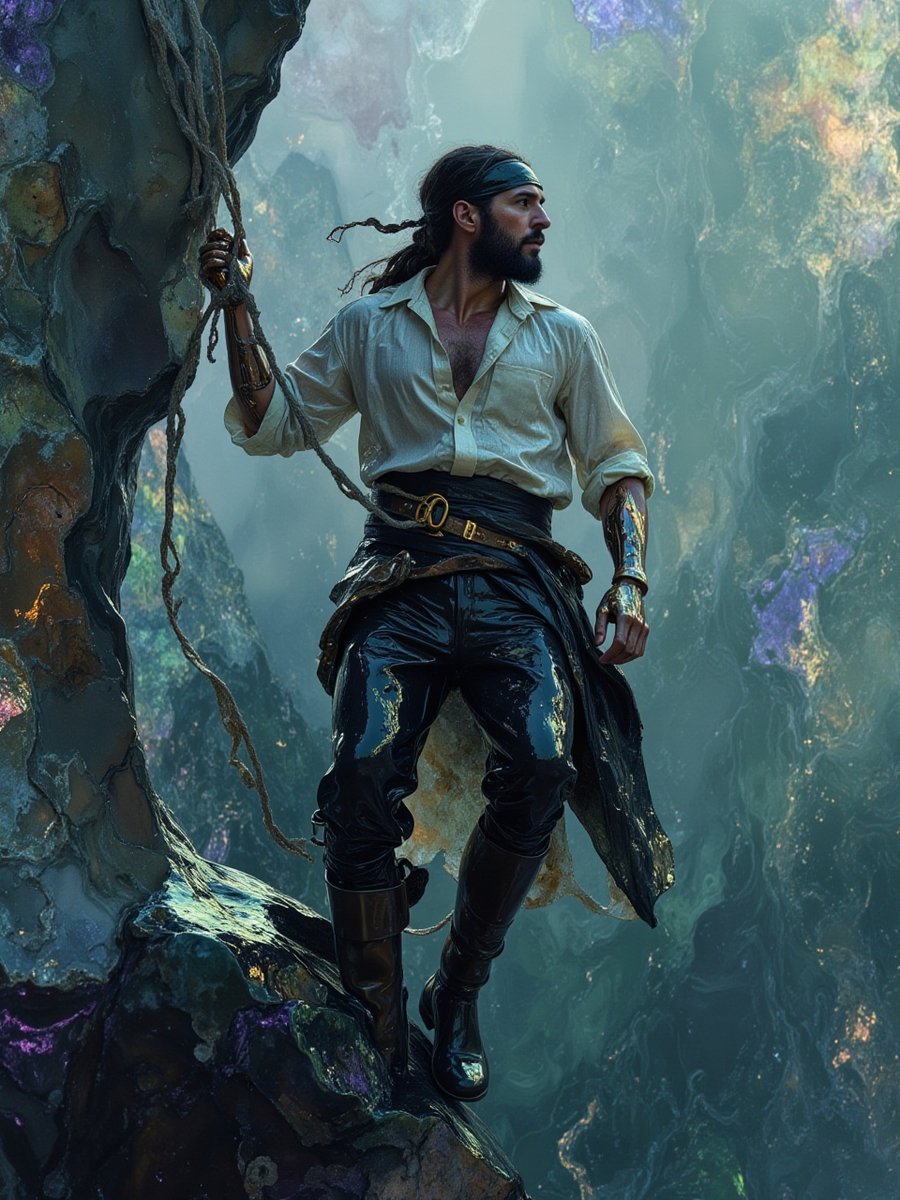 Парусный: Pirate is hanging on a sails ropes of a ship, looking into the distance, camera position is below him. Pirate is wearing white shirt and standart trousers, he has a wooden prosthetic hand. Pirate is surrounded by sea in stormy weather.