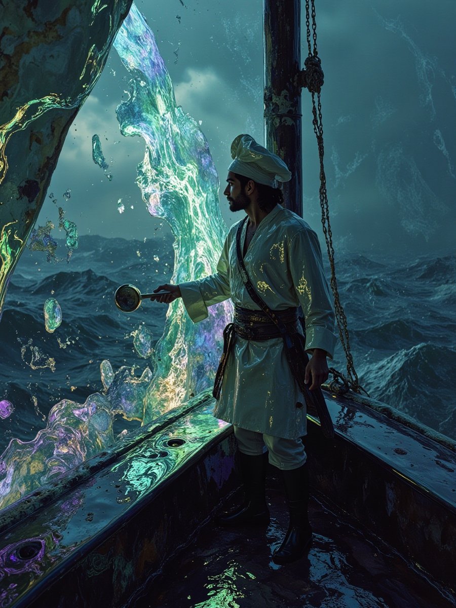 Кок: Pirate on a ship, looking into the distance, camera position is below him. He is a cook. He wears a chef’s hat, lots of white clothes, holds a metalic scoop. Pirate is surrounded by sea in stormy weather.