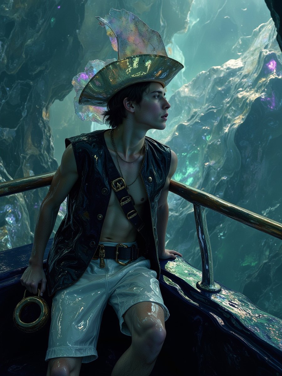 Штурман: Pirate is on a ship, looking into the distance, camera position is below him. pirate is 18 year old boy, with a origami paper boat on his head and with a compass in his hand. He wears white short and a black vest. Pirate is surrounded by sea in stormy weather.