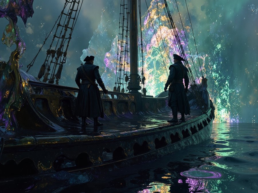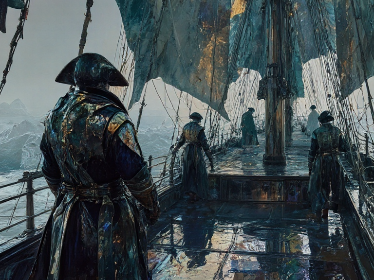 Pirate captain is standing on a captains bridge on an old brigantine ship. View from behind the captain. There are 8 pirates working on the upper deck, they look like this: https://disk.yandex.ru/i/qqpmpoI5nCT2pA https://disk.yandex.ru/i/ONIPcqwJZXrSKg https://disk.yandex.ru/i/tMqerwGT4oT1HQ https://disk.yandex.ru/i/9ZHIvxHFHBT0jQ https://disk.yandex.ru/i/gAR979hZ4x8j5Q https://disk.yandex.ru/i/EihUTGebMFQYeQ https://disk.yandex.ru/i/MtCE3jsYqXHI8w https://disk.yandex.ru/i/uOwjp81dlGbLog, They are surrounded by sea in stormy weather