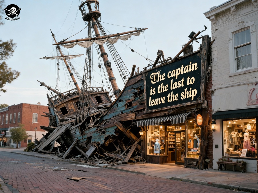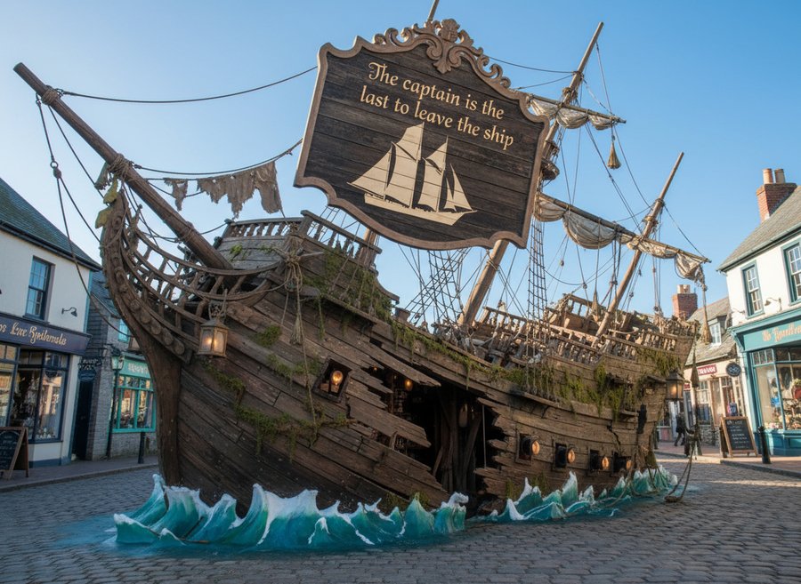 A store located in town is designed like a sinking broken pirate ship. On the store sign is written text: The captain is the last to leave the ship font: wardshus calligraphy regu with this logo @logo