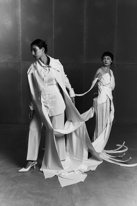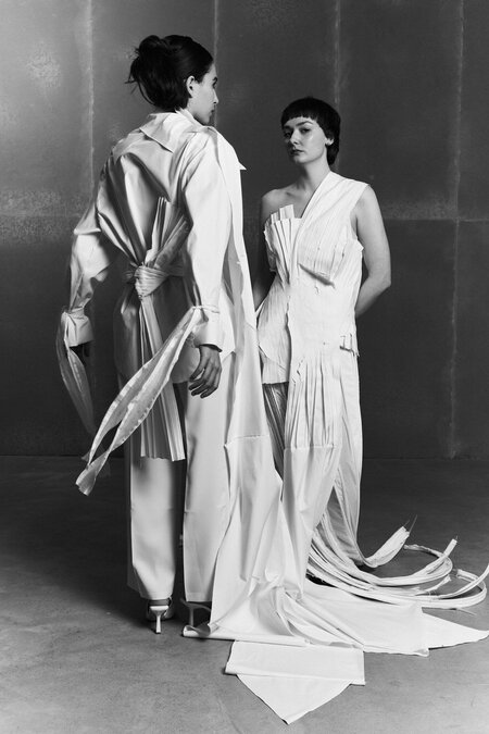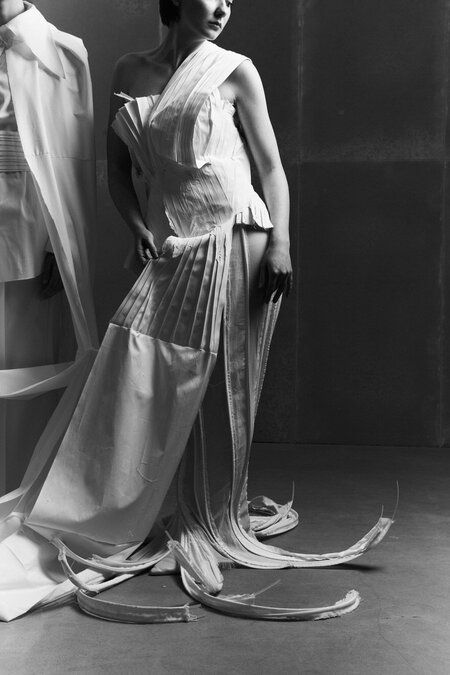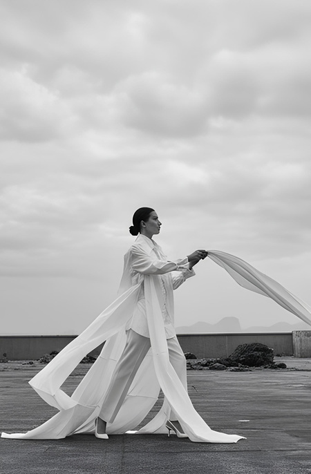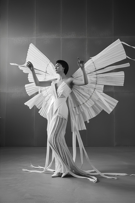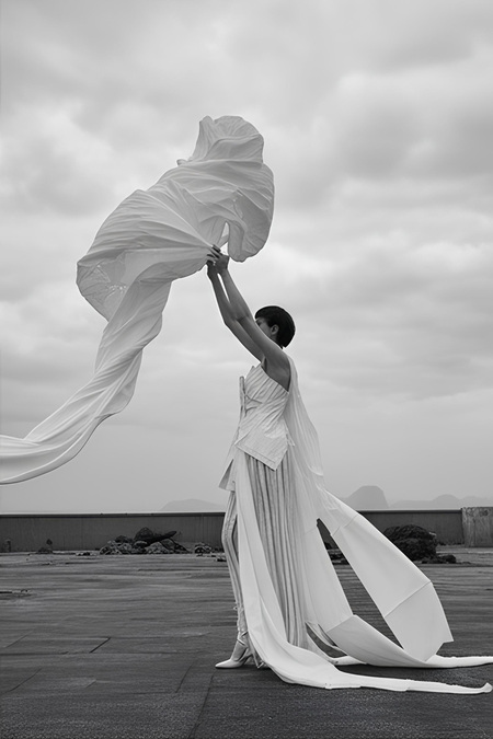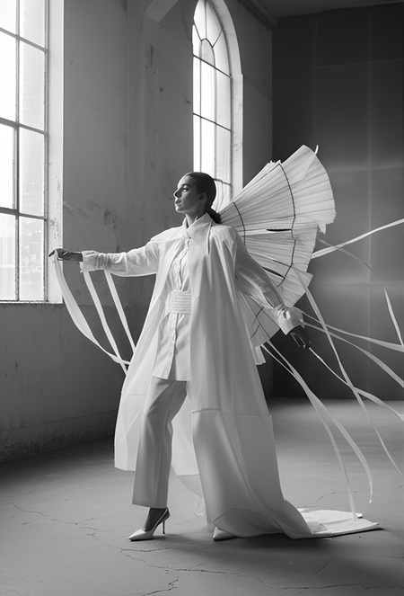 Create an editorial fashion series inspired by the attached photos but not based on them directly. Design new avant-garde garments that continue the aesthetic of the original costume — light, sculptural, and poetic. Add more layers of flowing, flying fabric that move through the air like paper or kites in the wind. Change the location to a spacious minimalist environment — for example, an open industrial hall, rooftop, or cloudy landscape — filled with soft diffused light. Use different models with expressive poses and gestures that emphasize movement, connection, and distance. The final images should look like a cohesive fashion collection inspired by paper, air, and the theme of lost communication.