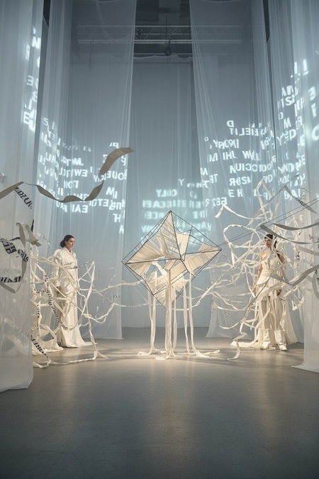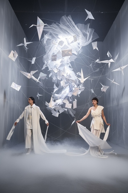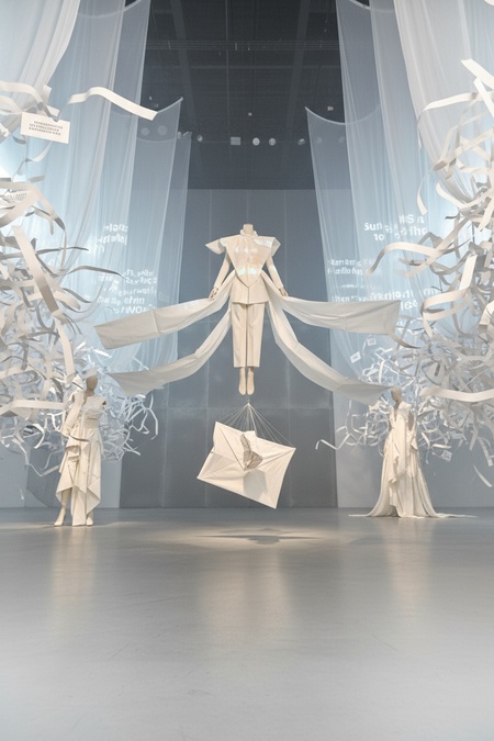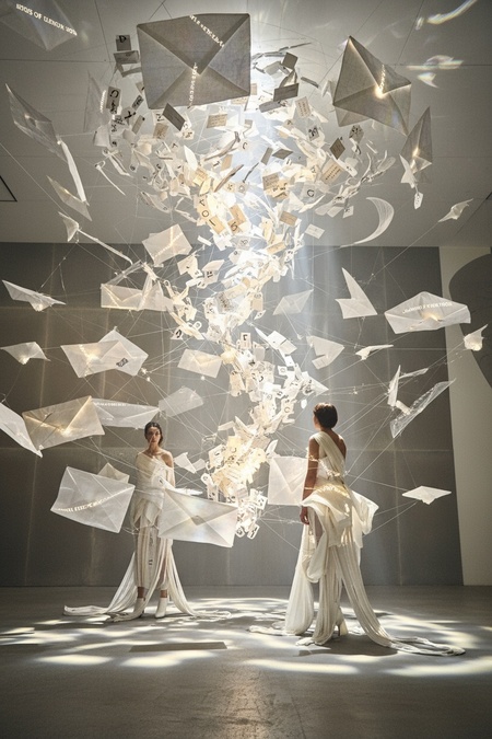 Create a surreal, large-scale fashion installation inspired by the attached photos (for inspiration only, not for direct use or reconstruction). The concept: «The Post Office of the Wind» — a futuristic dream-laboratory where letters dissolve into fabric, and fabric turns into light. The entire showroom behaves like a living organism. The walls are made of translucent membranes that expand and contract, as if breathing. From the ceiling, hundreds of luminous textile kites and envelope-shaped sculptures float midair, connected by thin silver threads. Each movement of air causes a chain reaction — fabrics ripple, lights shimmer, projections of phrases scatter across the surfaces like thoughts escaping into air. Avant-garde mannequins in experimental garments stand within the flow — their clothes made of layered, semi-transparent materials that seem to evaporate. The main installation centerpiece is a colossal swirling vortex of fabric and paper, suspended in zero gravity, glowing from inside — like a storm of letters caught in time. The lighting is cinematic and fluid: fog, refracted beams, reflections on textile surfaces. The entire scene feels like the moment between message and silence — chaotic, poetic, and otherworldly. Inspired by the theatrical intensity of Gentle Monster and the emotional minimalism of fashion conceptualism. Focus on motion, surreal scale, and emotional impact.