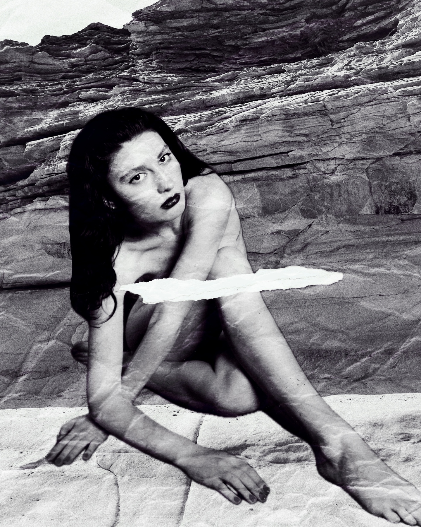 Тело-конструкт: четкие линии, ретушь, неестественные позы, включение элементов, холодная цветовая гамма. Тело-опыт: тактильные поверхности (земля, вода, песок), естественные несовершенства, акцент на ощущениях. Коллаж как синтез/конфликт: Эти элементы сталкиваются, накладываются, спорят друг с другом внутри одного изображения, создавая визуальный аналог внутреннего конфликта и поиска целостности. Фоном для этой телесной драмы сознательно выбрала природу. Это не просто эстетический ход, а концептуальное решение: Природа, в противовес урбанистической среде, насыщенной дисциплинарными кодами, предстает как пространство относительной свободы от социального надзора.