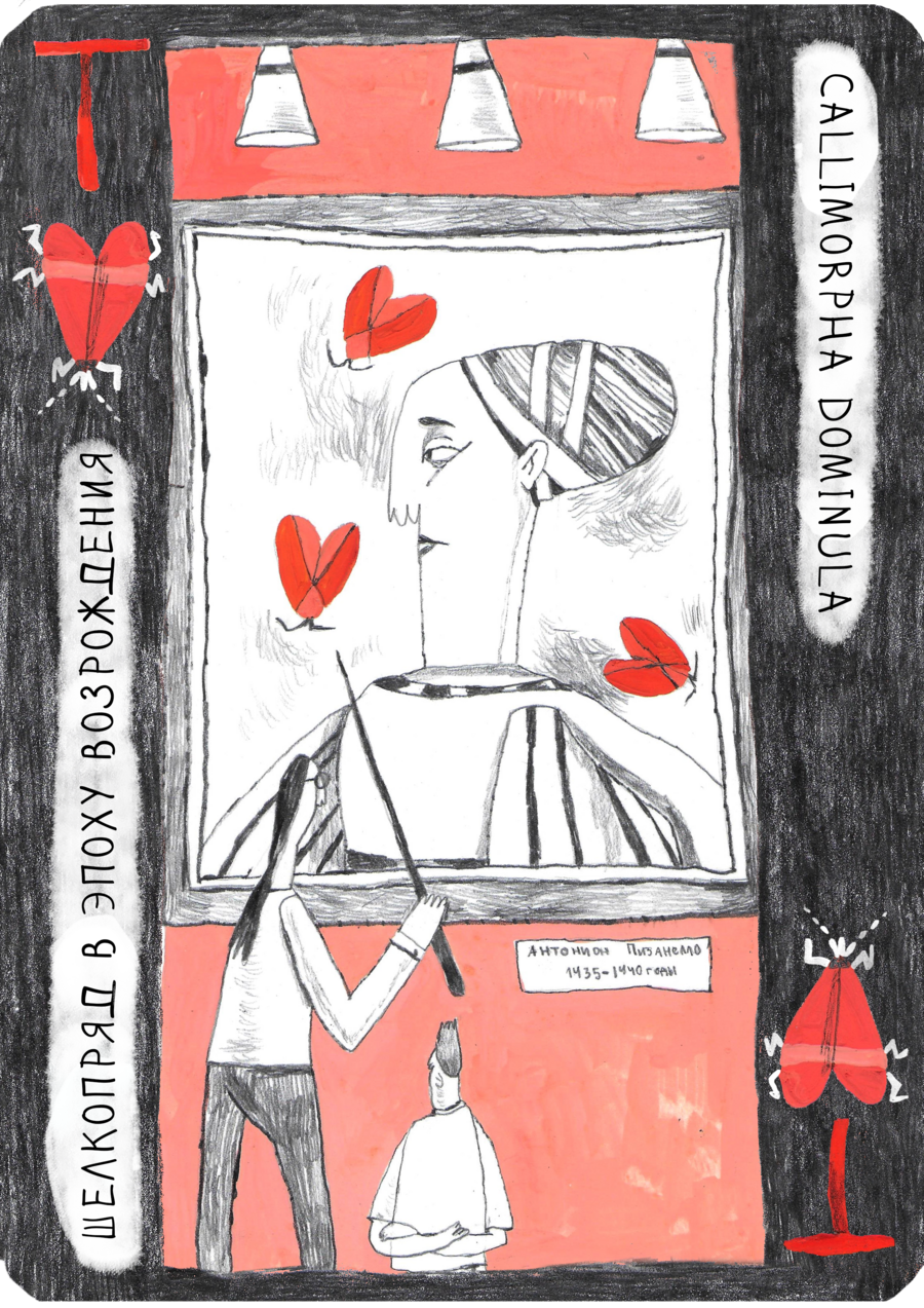 При разработке техники для каждой отдельной масти я руководствовалась материалами: гуашь и карандаш. Они оставались неизменными, но функции для разных мастей отличаются. Так, для червей гуашь является акцентом, в то время как для пик она лишь фон, чтобы подсветить графит.