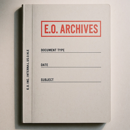 Архивное дело - Обложка из плотного серого или бежевого картона, текстурированная, как у папок «Дело №». - На обложке крупный штамп E.O. Archives, поле для подписи: DOCUMENT TYPE: __________ DATE: __________ SUBJECT: __________ - На корешке — вертикальная надпись «E.O. INC. INTERNAL USE ONLY». - Эстетика — бюрократический минимализм meets офисный хорор
