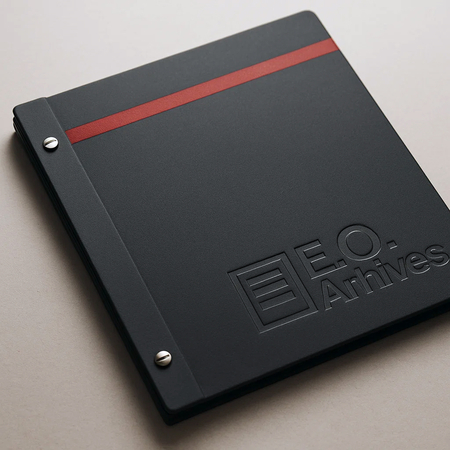 Брутально-корпоративный - Минималистичный чёрный или графитовый блокнот с красной полосой (фирменный акцент). - Тиснение логотипа E.O. Archives в уголке. - Может быть строгий переплёт с винтами, как у отчётных документов.