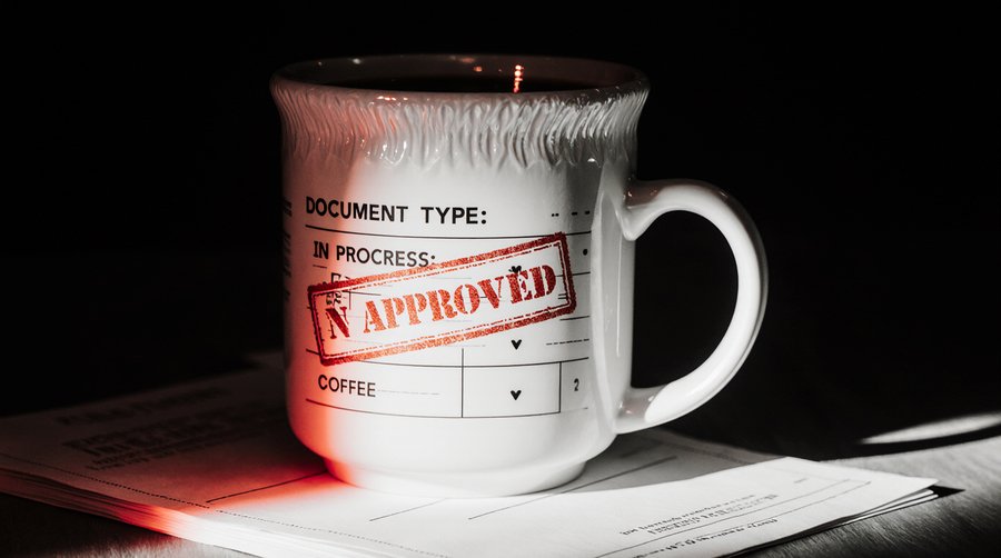 (1) Krea: mug labeled «DOCUMENT TYPE: COFFEE / STATUS: IN PROGRESS / ACCESS LEVEL: INTERNAL USE ONLY», with a red «APPROVED» stamp. white ceramic, monospaced text printed like an office form. dark and red lighting
