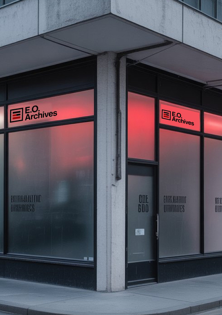 E.O. Archives shop exterior located in brutalist concrete building in urban environment, large matte glass windows with metal frames, minimal black and red signage, cold daylight with soft red accent