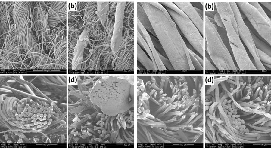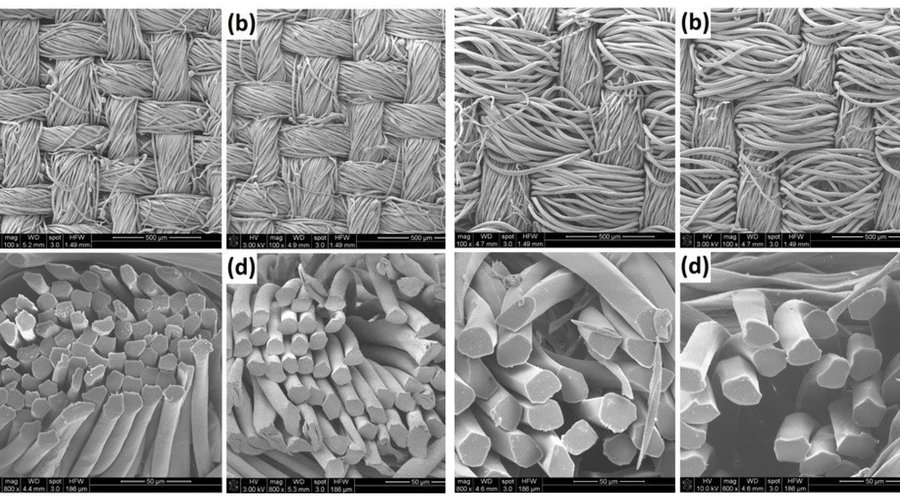 Сравнение структур хлопково-полиэфирных тканей до и после нагрева с помощью электронного микроскопа.