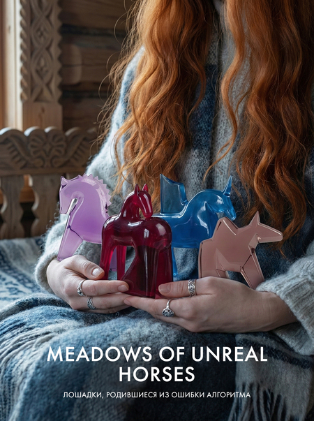 Meadows of Unreal Horses — это серия фигурок-лошадок, в которой за основу взяты не «правильные» изображения, а ошибки нейросети. Использованы те формы, где алгоритм «спотыкался» и генерировал гибридные, невозможно изогнутые или чрезмерно упрощенные тела лошадей.