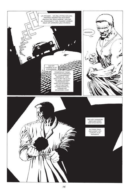 Фрэнк Миллер в Sin City использует контраст чёрного и белого так, как будто каждая тень — самостоятельный персонаж. На выбранных страницах лица скрыты в чёрных массивах, а тела обозначены резкими белыми силуэтами, что превращает сцены в почти театральные композиции.