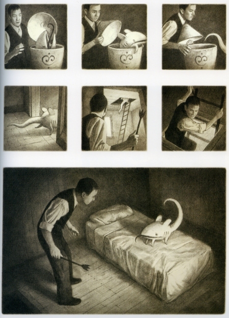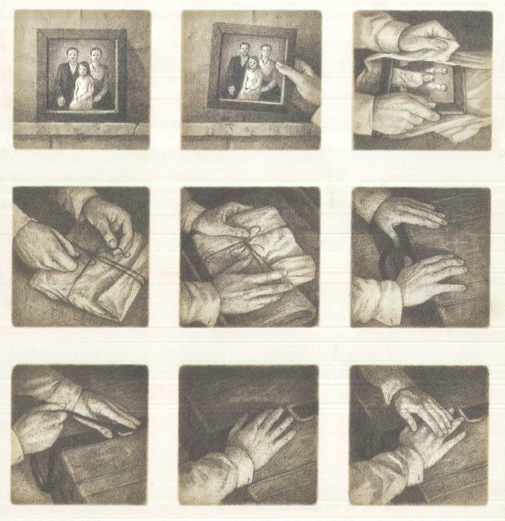 В The Arrival Шона Тана эмоции строятся на минимальных жестах и плавных переходах между кадрами, даже несмотря на полное отсутствие текста. Страницы намеренно почти пусты: персонажи занимают лишь малую часть пространства, а фоны сведены до мягких размытых форм. Это позволяет показать, как отсутствие детализации может усиливать чувство одиночества, растерянности или ожидания.