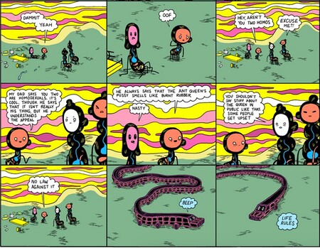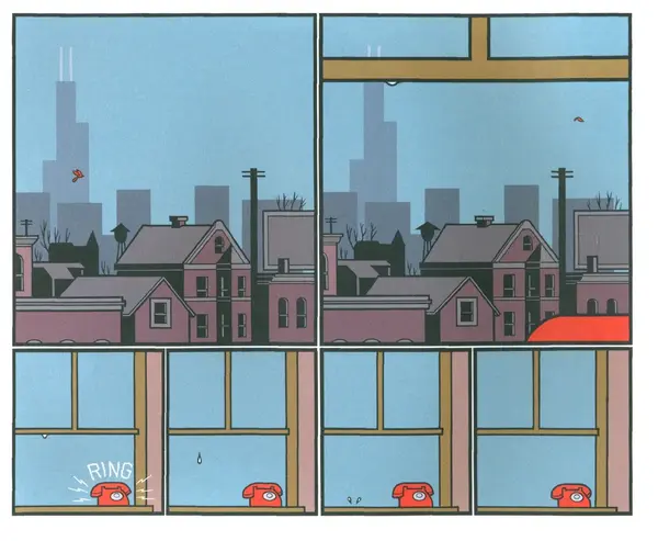 Jimmy Corrigan Криса Уэйра выстраивает сеточную структуру страницы с помощью пустых зон, где каждая клетка становится ритмическим ударом, а редкие линии задают тональность кадра.