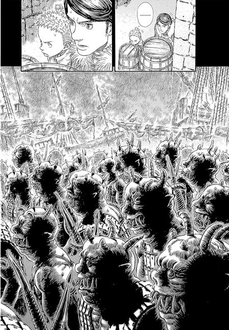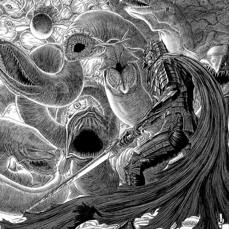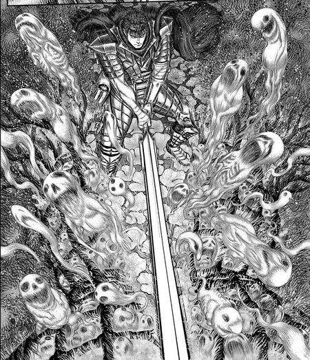 В Berserk Кэнтаро Миуры детали превращаются в эмоциональный инструмент: в сценах битвы или мрачных пейзажах каждая царапина, складка ткани или элемент брони передают напряжение мира. Выбранные страницы создают атмосферу угрозы и хаоса именно за счёт перегруженности.