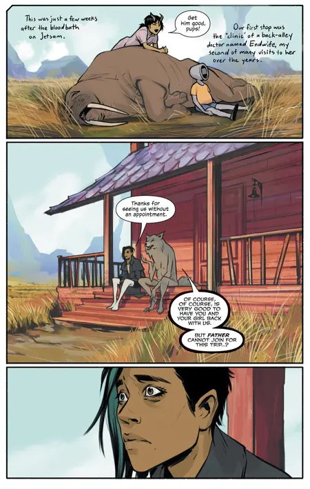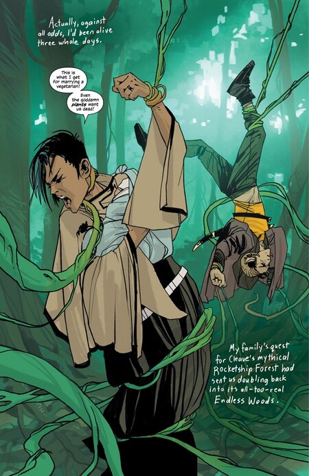 В Saga Фионы Стейплз минималистичный дизайн персонажей сочетается с богатой средой, создавая ясный фокус внутри сложного мира.
