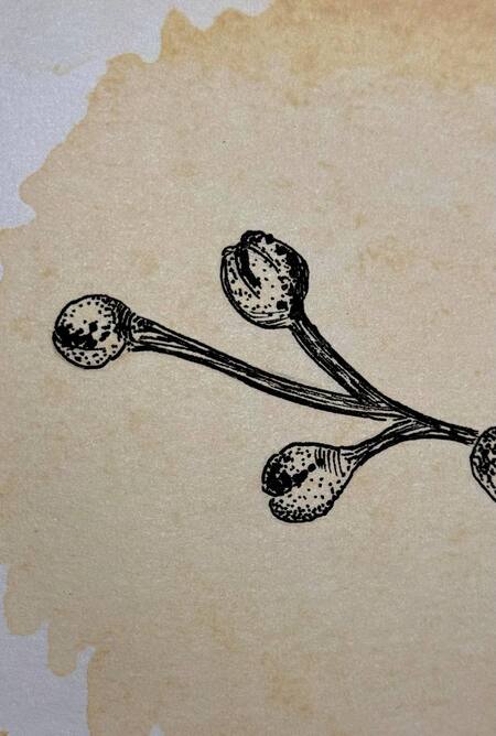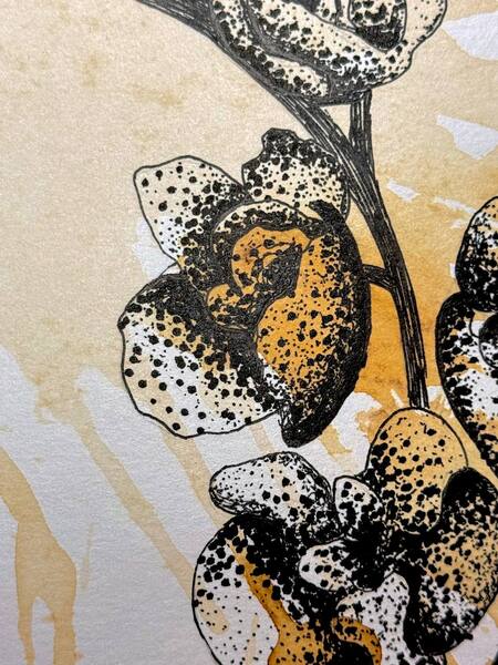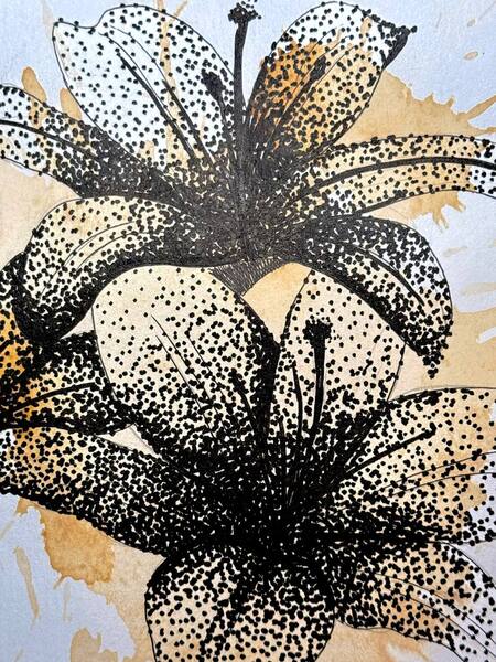 Мой разлитый чай и цветы — это совокупность случайного и намеренного. Чай разливается хаотично, в его кляксах можно разглядеть разные образы, но я намеренно изображаю только цветы.