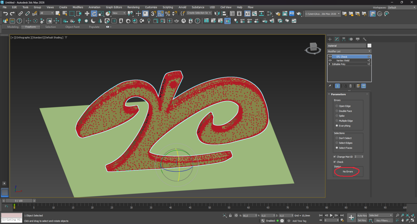 Готовую модель скачала в формате FBX и открыла в программе 3Ds Max. В программе я поправила геометрию в 'edit poly', добавила модификатор 'tessalate' для упрощения и правильности геометрии. После добавила 'vertex weld', чтобы все точки соединились. И последним стал модификатор 'stl check', который проверяет модель и выявляет ошибки.