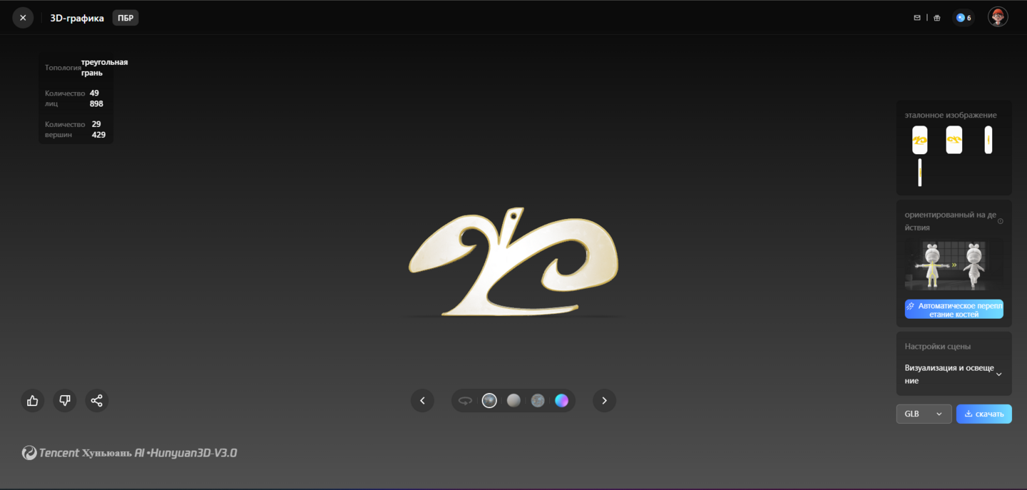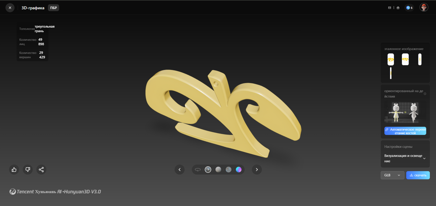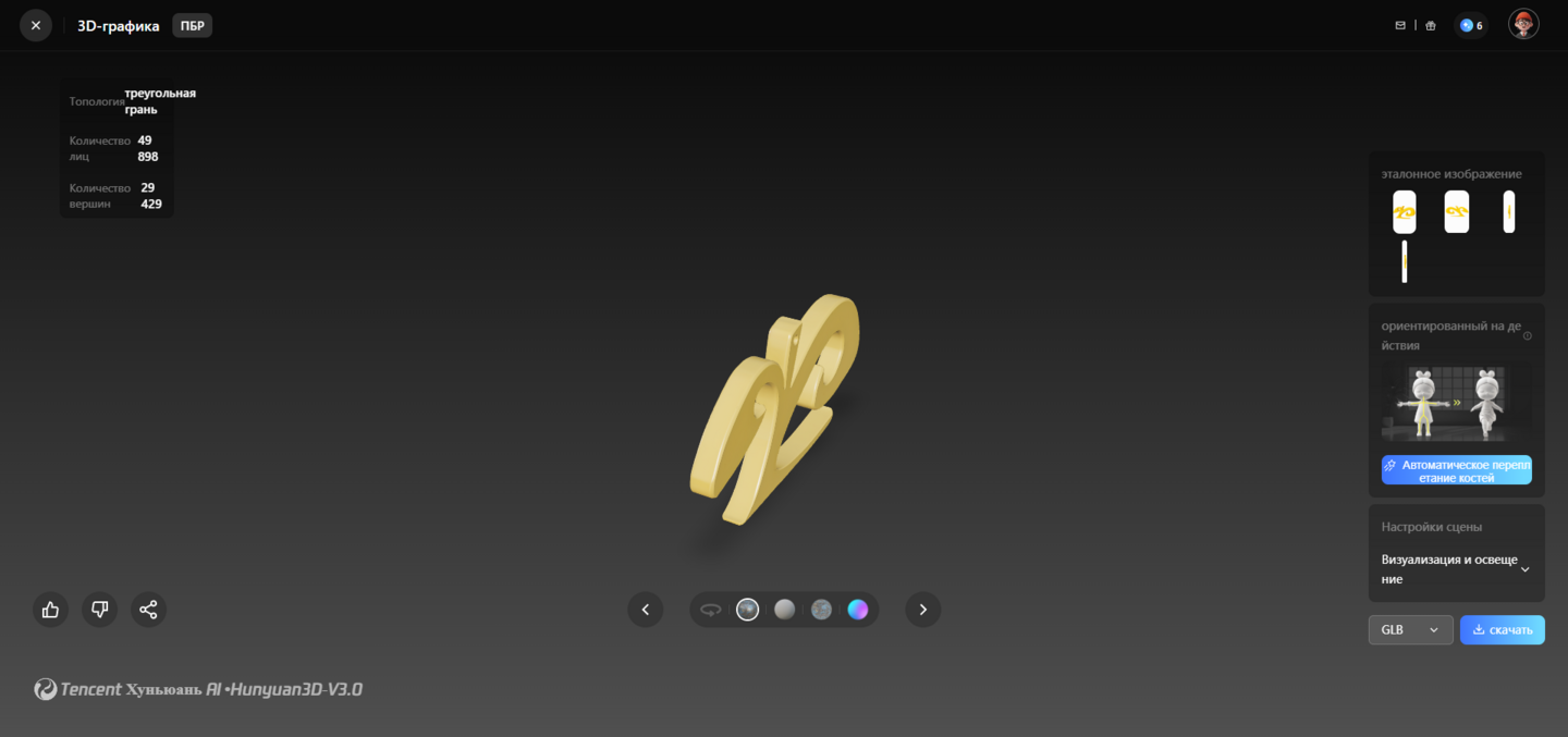 Для создания 3D модели по ракурсам, сгенерированные в Chat GPT, я использовала китайскую нейросеть 腾讯混元3D (Тенсент Хунюань).