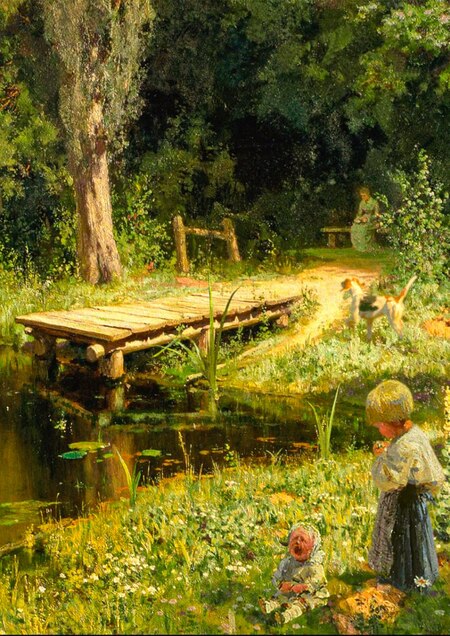 В процессе работы композиция дополнилась новыми деталями — детьми, животными, лодкой и другими элементами. Эти штрихи будто оживили пространство, наполнили его движением, светом и теплом. Пруд, некогда тихий и заброшенный, словно обрёл новую жизнь, зазвучал дыханием природы и присутствием человека.