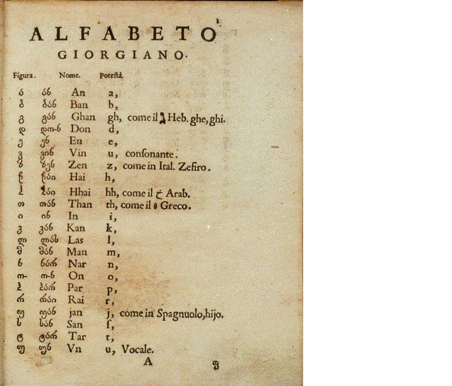 Основы письма грузинскими буквами. Грузино-итальянский словарь. Рим, 1629 (прототип: нусхури).