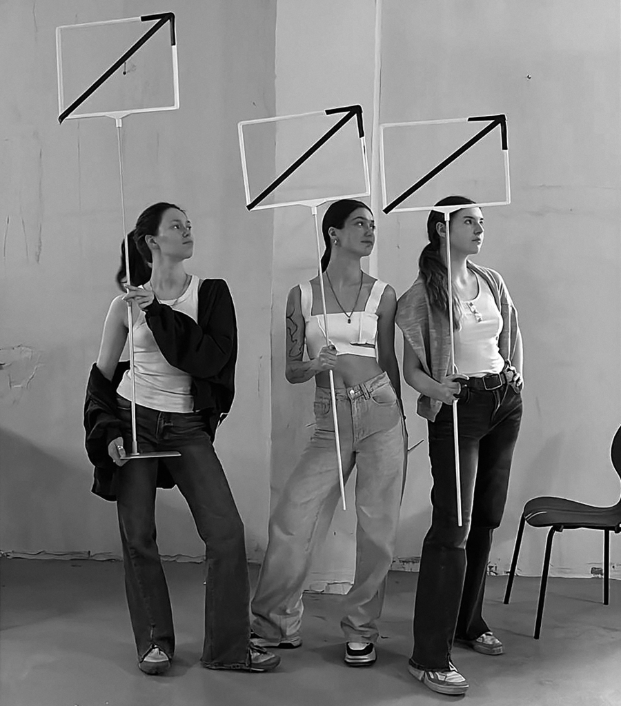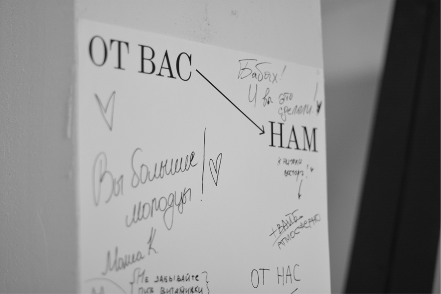 Стрелки также стали важным элементом в дизайне выставки — не только как указатели, а как продолжение мысли «от и до»: темы расходились от общих точек до самых разных уголков визуальной среды. Таким образом, выставка все время вела зрителя от точки до точки, тем самым организуя пространство как внутри носителей (будь то постеры, наклейки или посты в соцсетях), так и в пространстве самой выставки, не давая зрителю потеряться