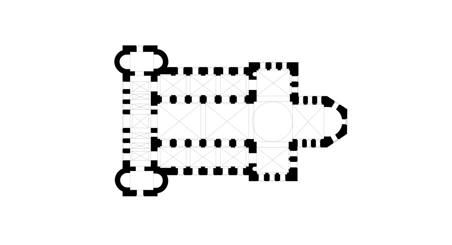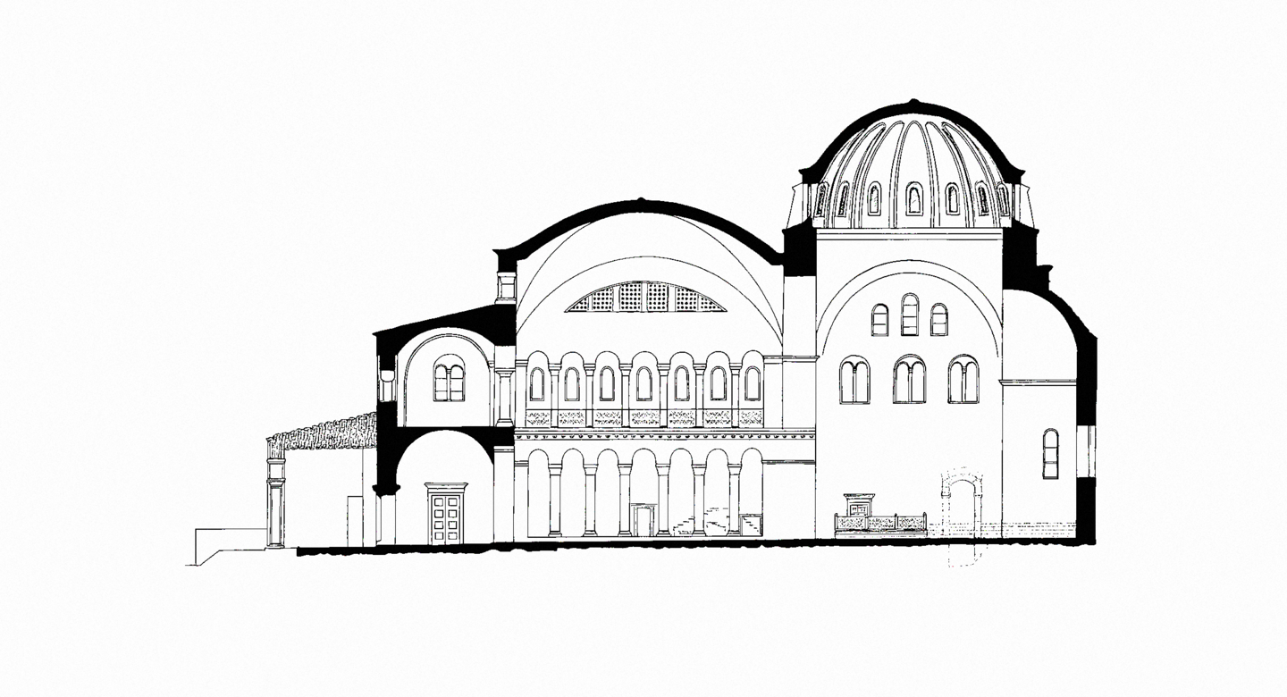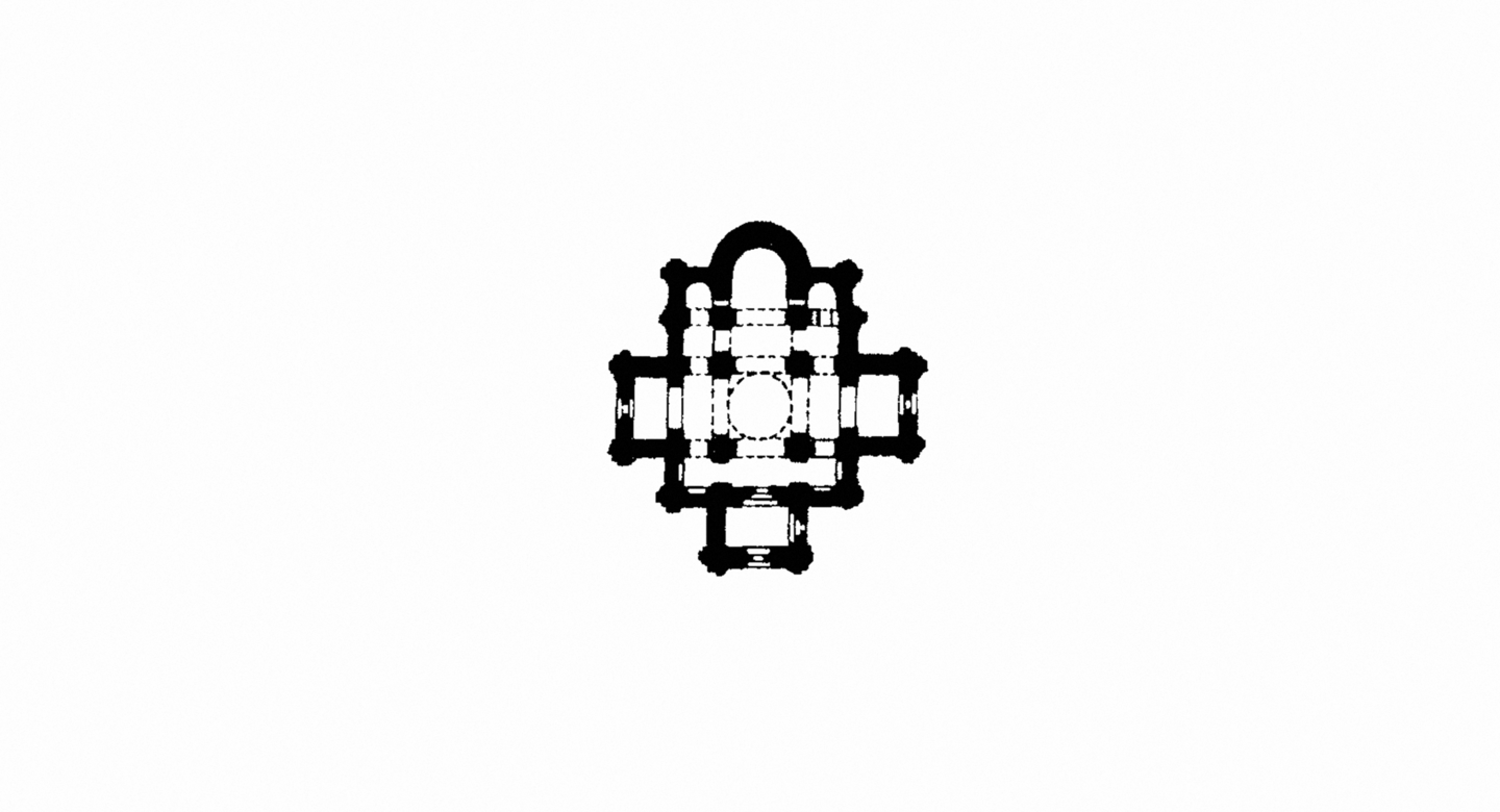 Здесь в ход вступает геометрия. Основное пространство храма (помним, что левая часть с нартексом нас не интересует) создает равносторонний крест, где пространство в середине (подкупольное) — самое большое по площади. Рукава креста ни с одной из четырех сторон не уходят далеко и не создают доминантных автономных пространств. Все это дополняется верхним купольным освещением — здесь форма уже статична, нанизана на светлую ось и не направляет нас куда-либо. Интересно также отметить уходящие в романику треугольные формы, снаружи подчеркивающие эту вертикальность.