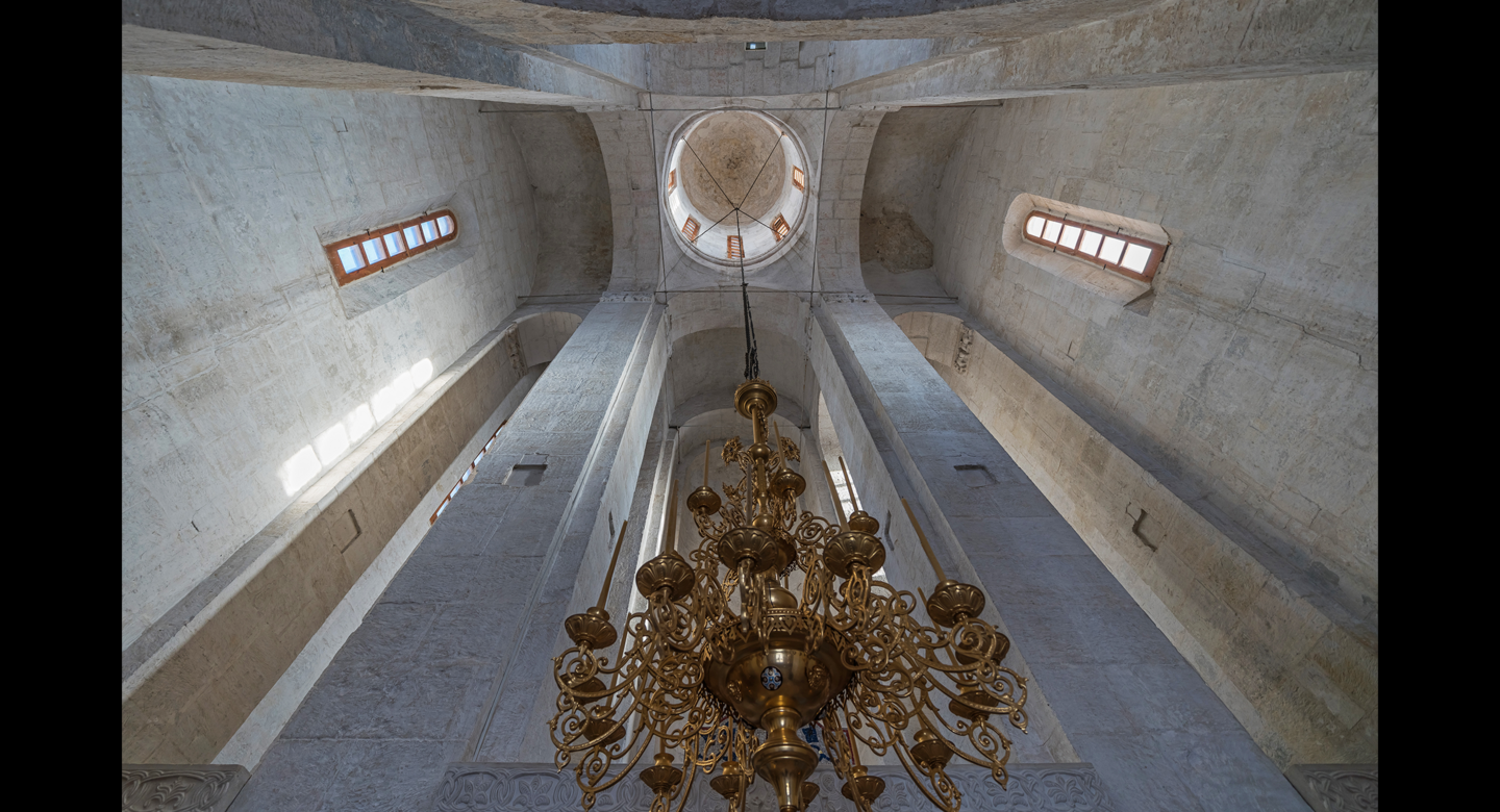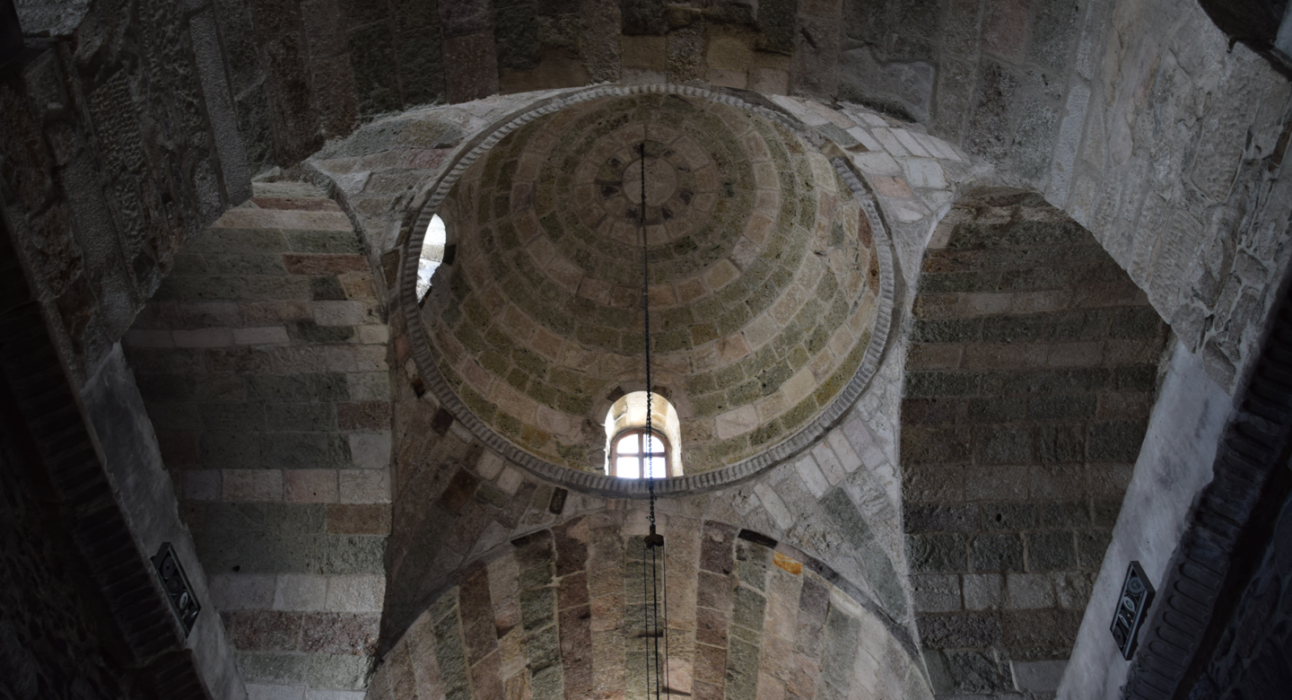 Еще один тетраконх, и тоже пирамидальный, подобный которому мы видели в Армении. Здесь интересно, что в восточной апсидной части находится больше всего окон, и за счет освещения нас немного подталкивают именно туда. Освещения и ритмики внутри купола, кажется, не хватает, чтобы спорить с этим направлением.