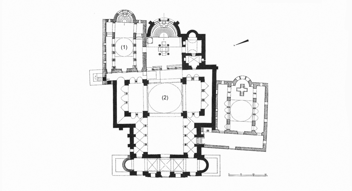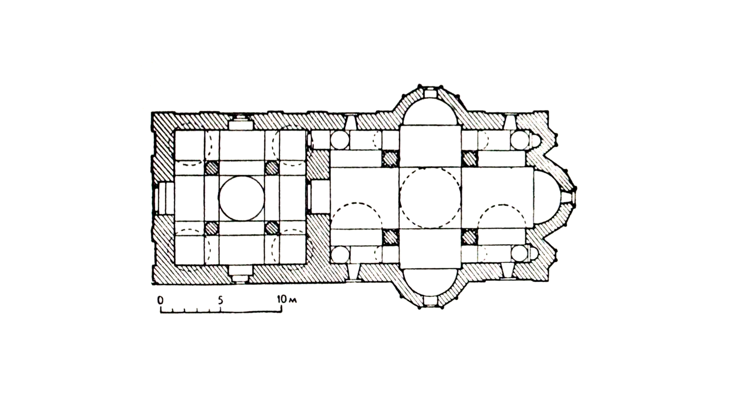 Даже среди более поздних храмов четырёхколонного крестово-купольного типа мы видим разительные расхождения в движении формы. Снова два храма, теперь уже X–IX веков, один пристроен к другому.