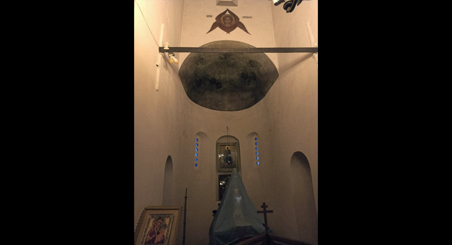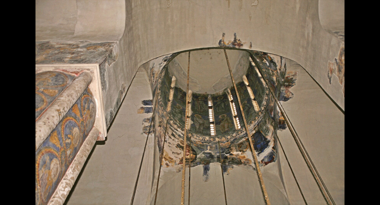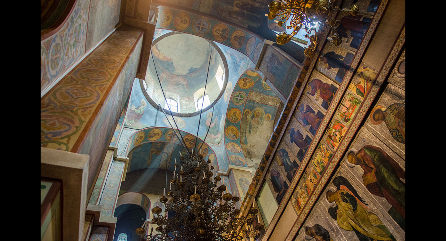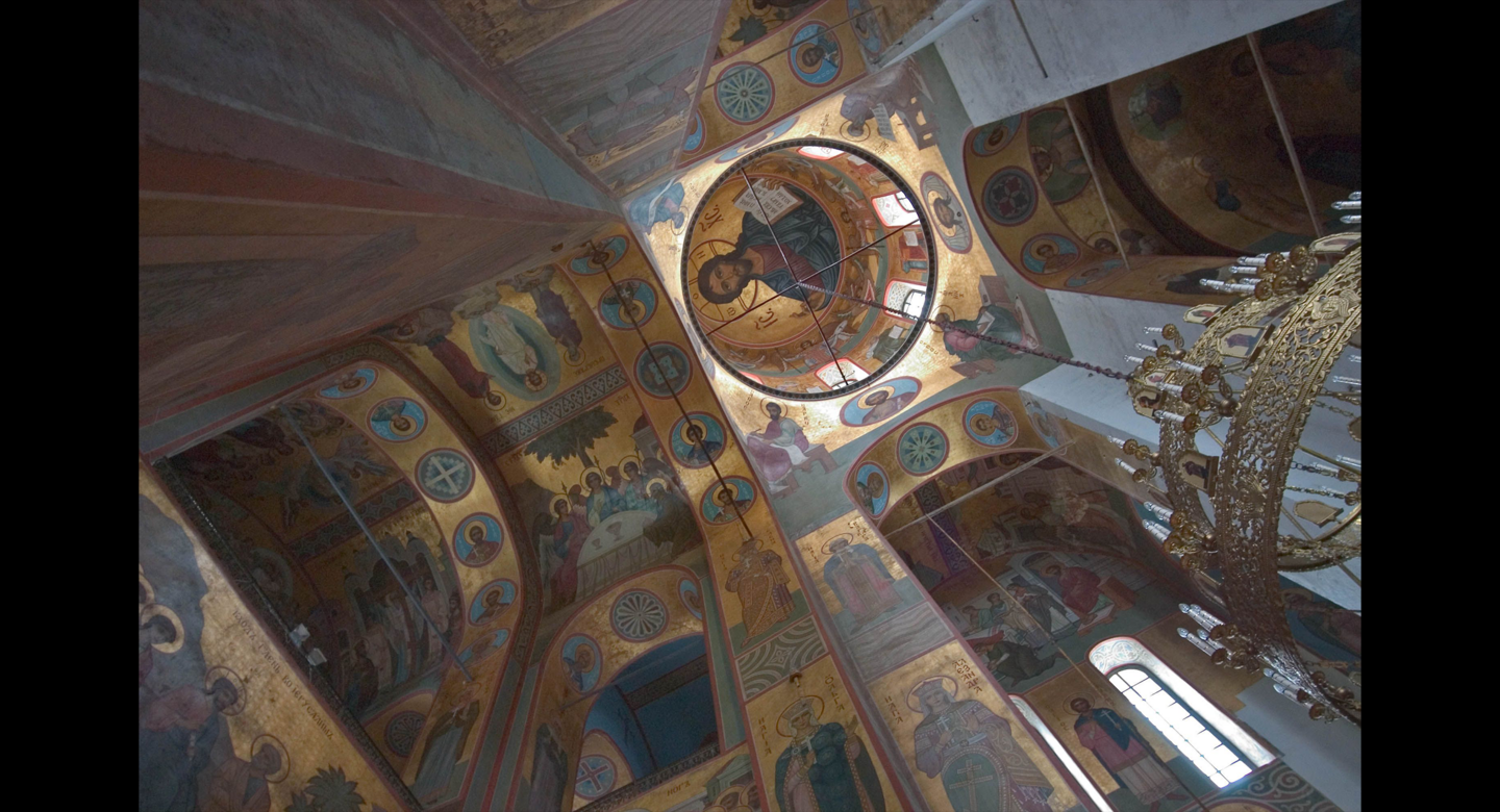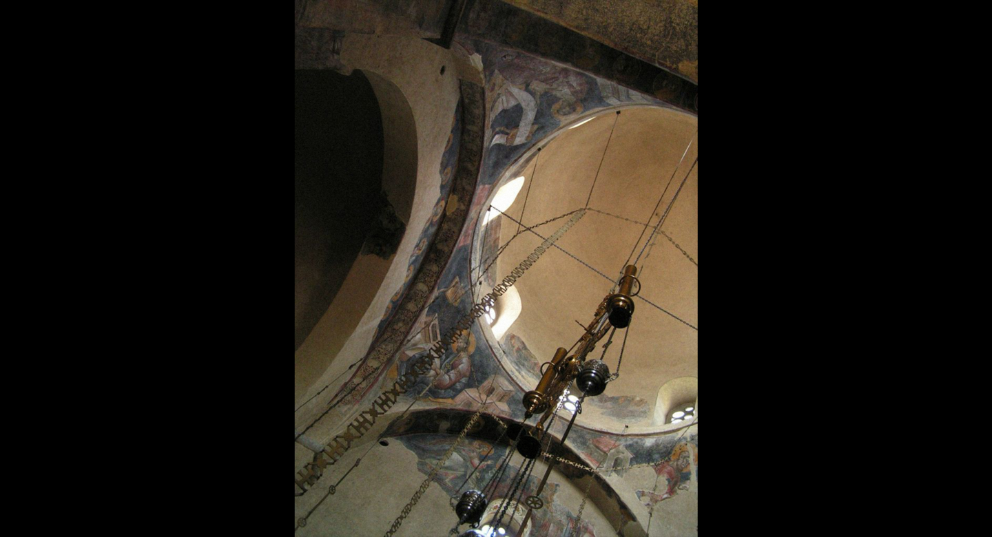 Насколько же различно ведет себя форма внутри: маленький и высокий купол храма Богородицы освещает наш путь, мы задерживаем на нем взгляд, но идем дальше — наш путь не прерывается. Нижний же, храм Св. Луки, целиком сосредотачивает наше внимание на объемном низком куполе — все будто указывает на него — множество сфер сходятся в середине, и мы останавливаемся прямо под ним. Интенция направлена не на апсиду (что интересно, она и не заменяется статикой!), а на купол — он он здесь главная точка напряжения.