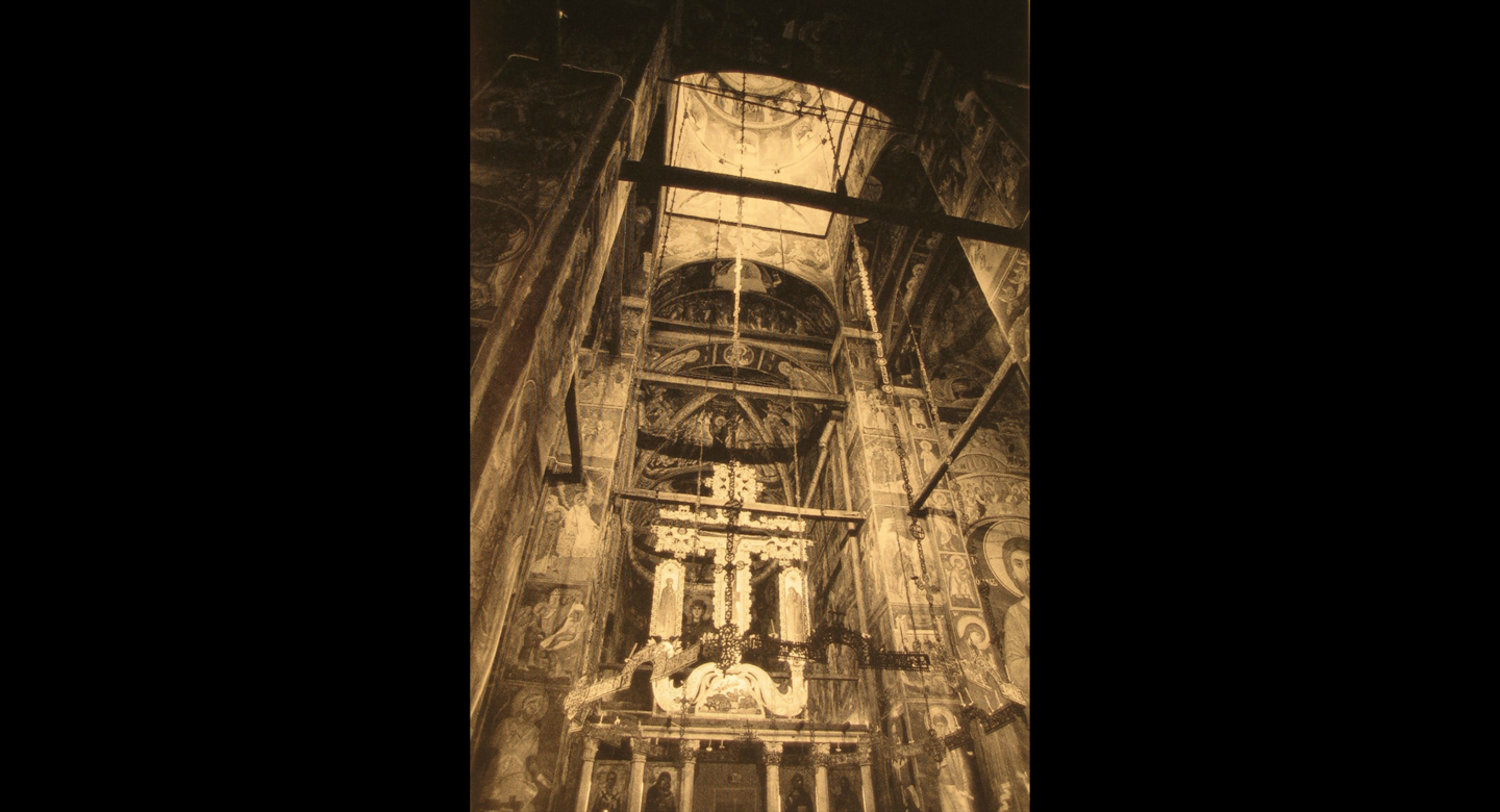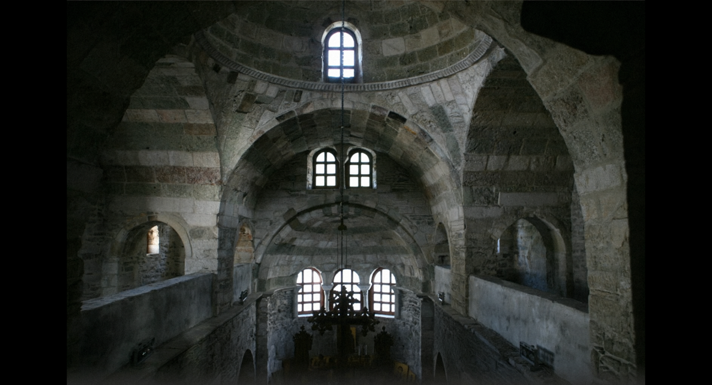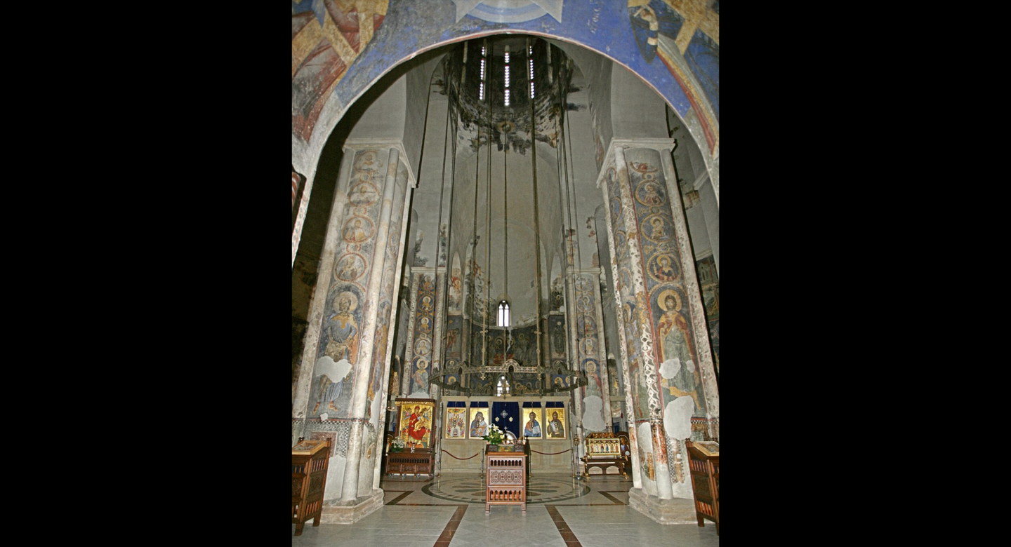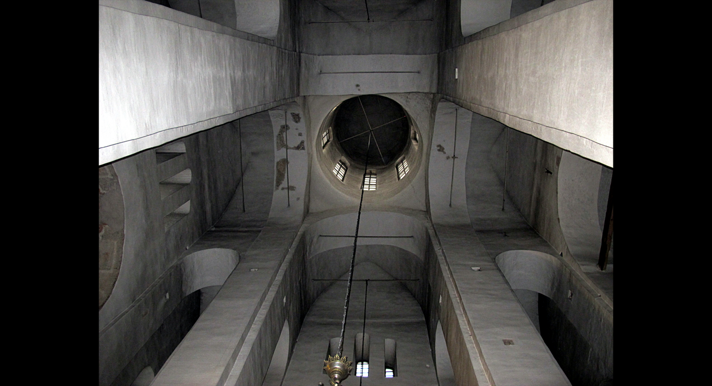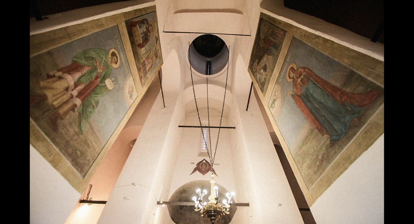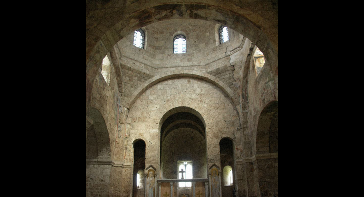 Насколько же различно ведет себя форма внутри: маленький и высокий купол храма Богородицы освещает наш путь, мы задерживаем на нем взгляд, но идем дальше — наш путь не прерывается. Нижний же, храм Св. Луки, целиком сосредотачивает наше внимание на объемном низком куполе — все будто указывает на него — множество сфер сходятся в середине, и мы останавливаемся прямо под ним. Интенция направлена не на апсиду (что интересно, она и не заменяется статикой!), а на купол — он он здесь главная точка напряжения.