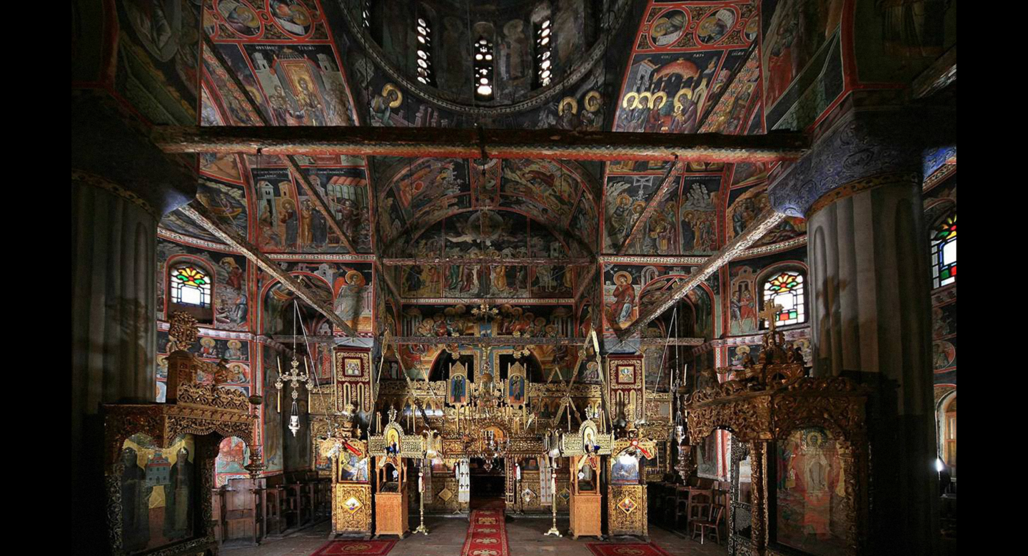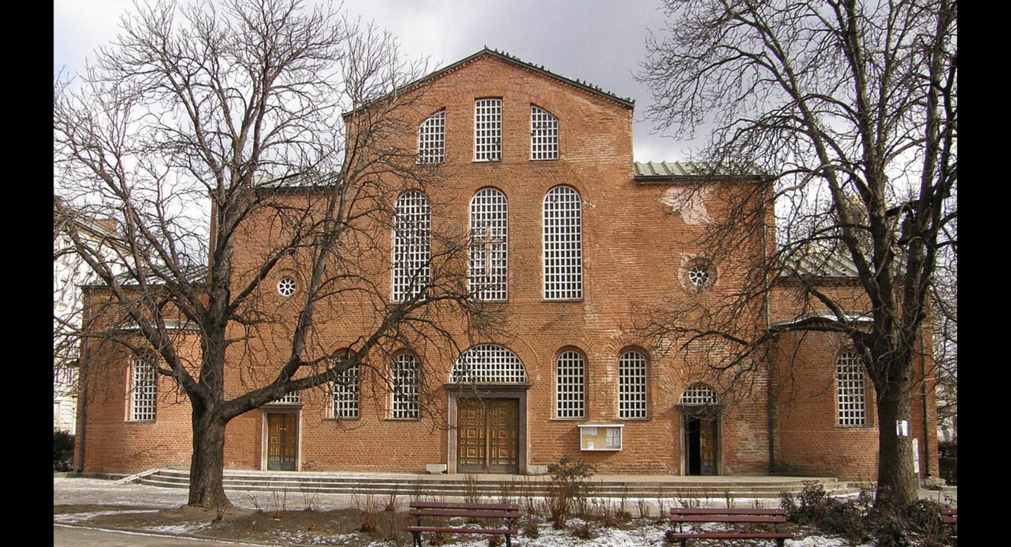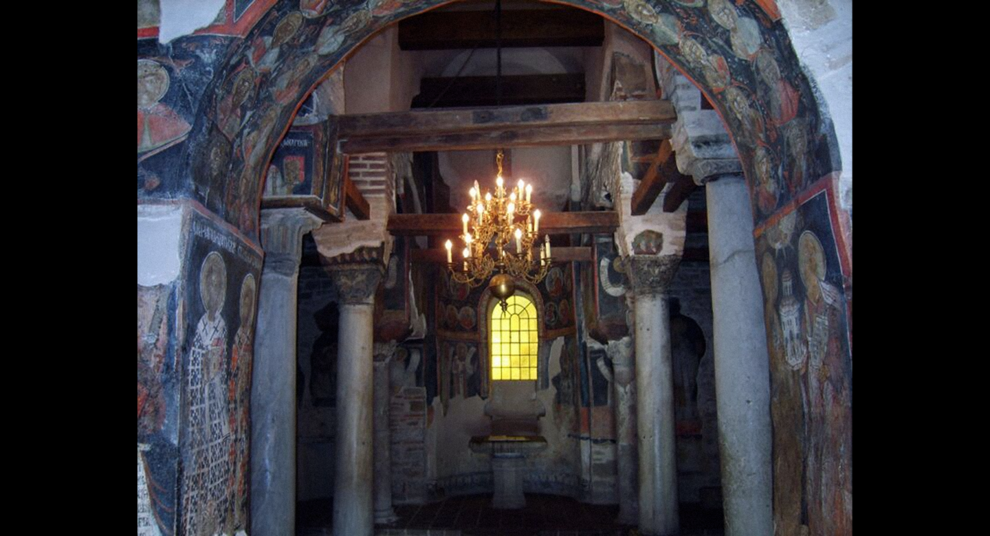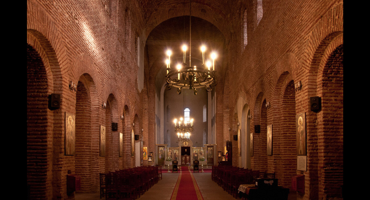 Тип купольного зала специфически характерен для позднеболгарской архитектуры, поэтому рассмотрим такой пример. Несмотря на явную направленность по западно-восточной оси, у храма совсем нет интанции толкать нас куда-то. Форма концентрируется в середине, под куполом — за счет работы округлых форм у скрытых опорных столбов и света (как сверху из купола, так и из окон по бокам).